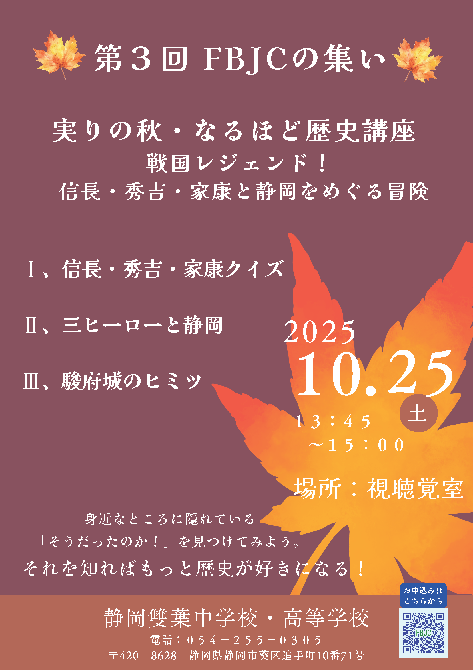 静岡雙葉中学校WEB出願システム(https://lsg.mescius.com/shizuoka-futaba/App/)へログイン後、「イベント登録」→「説明会一覧」→『第3回FBJCの集い「実りの秋・なるほど!歴史講座」』を選択してお申込みをお願い致します。