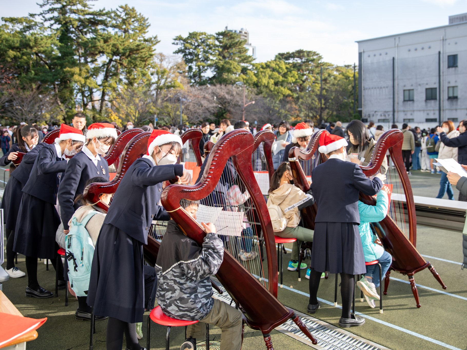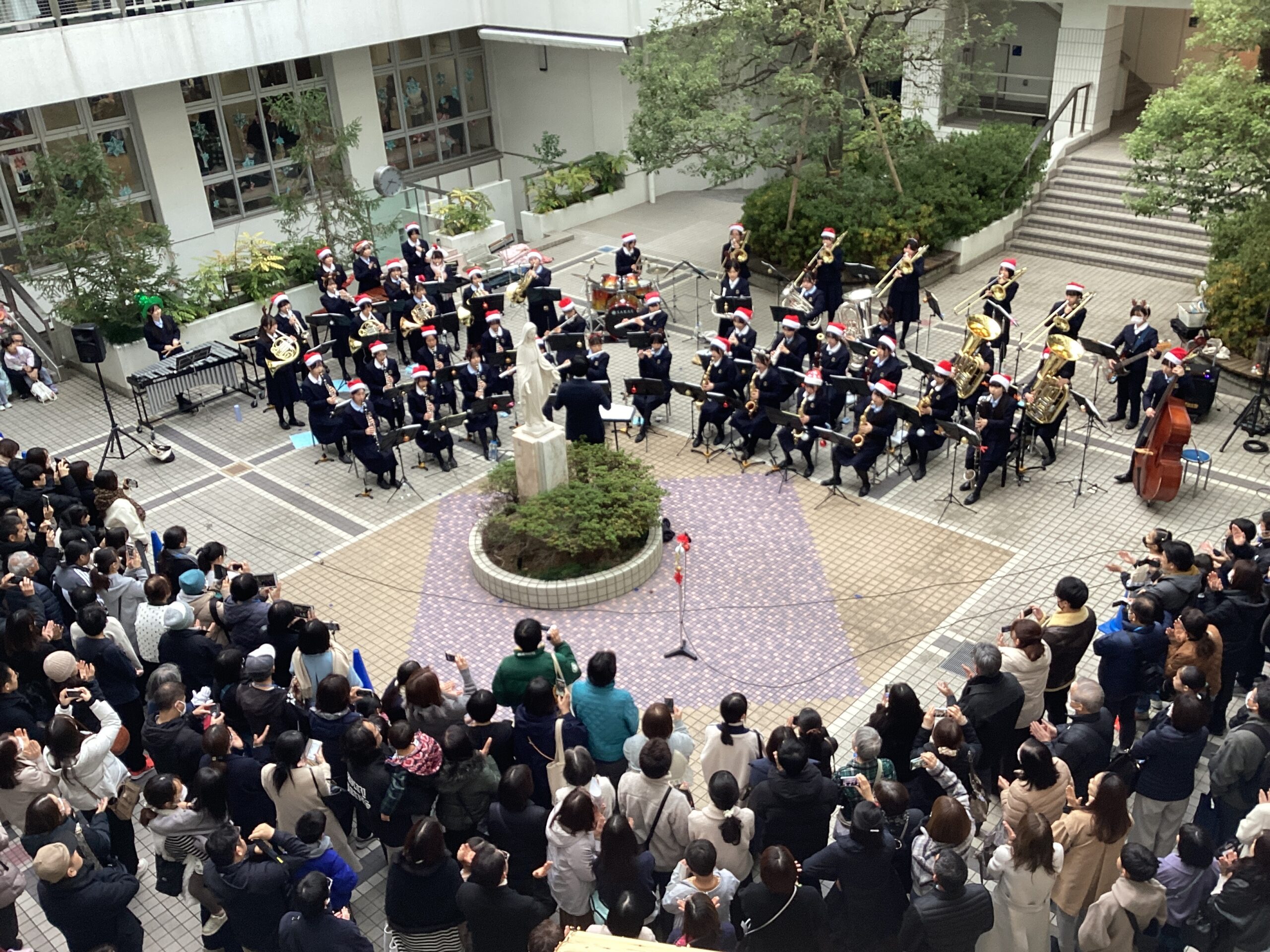 「あそび広場」の後は、講堂での「クリスマス会」に移ります。中庭では吹奏楽部がウェルカムコンサートを行いました。ハードロックで盛り上がった後にクリスマスソング、そしてNHKのチャリティソング「花が咲く」を演奏しました。