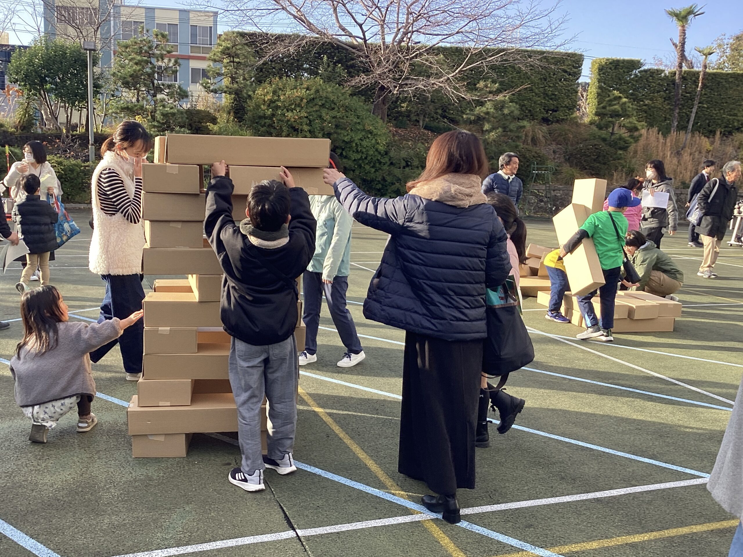 段ボールで作った巨大ジェンガも、山岳部の企画です。そっとパーツを引き抜いたり、崩れたものを組み立てたりと、自由に遊んでいただきました。