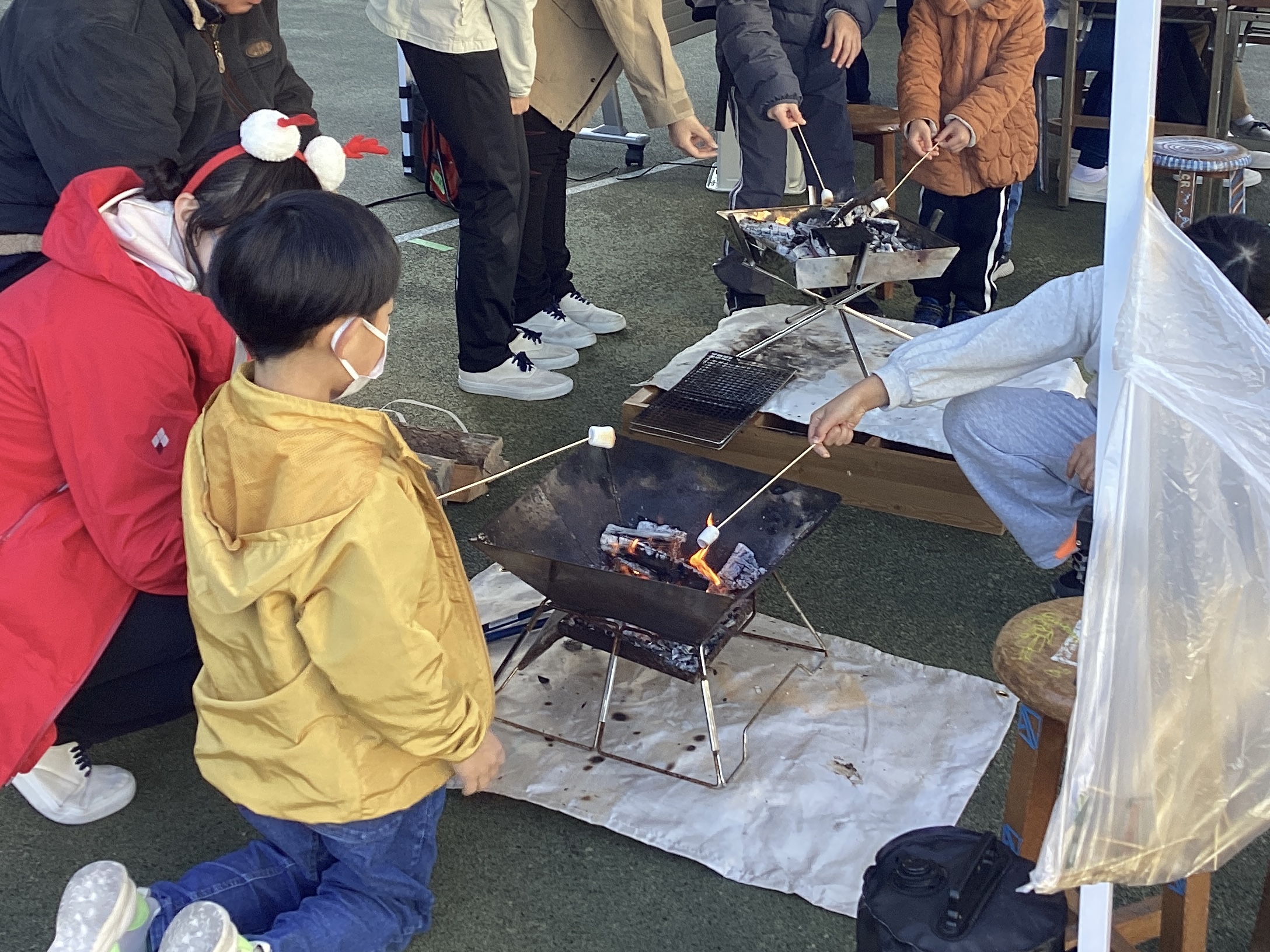 山岳部は、キャンプ用のテントを設置して、焚火で焼きマシュマロ体験をしました。