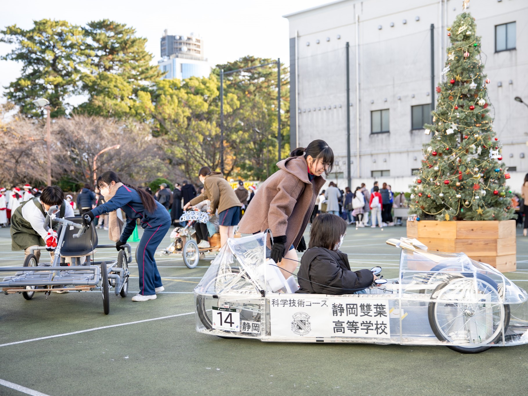 グラウンドの中央のクリスマスツリーは運動部の生徒が設置・飾り付けを担当しました。その周囲を、科学技術コース生徒たちによる、自作のエコランカーの試乗を行いました。今年東京と大阪で開催されたレースに実際に出場した車体です。
