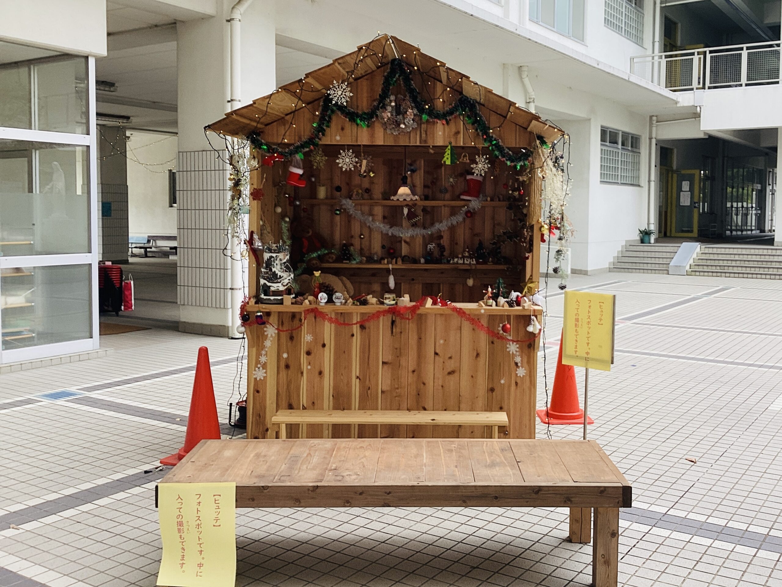校門を入ると、美術部有志の生徒と教員が製作したヒュッテがお出迎え。中に入って、フォトスポットとしてもお楽しみいただきました。