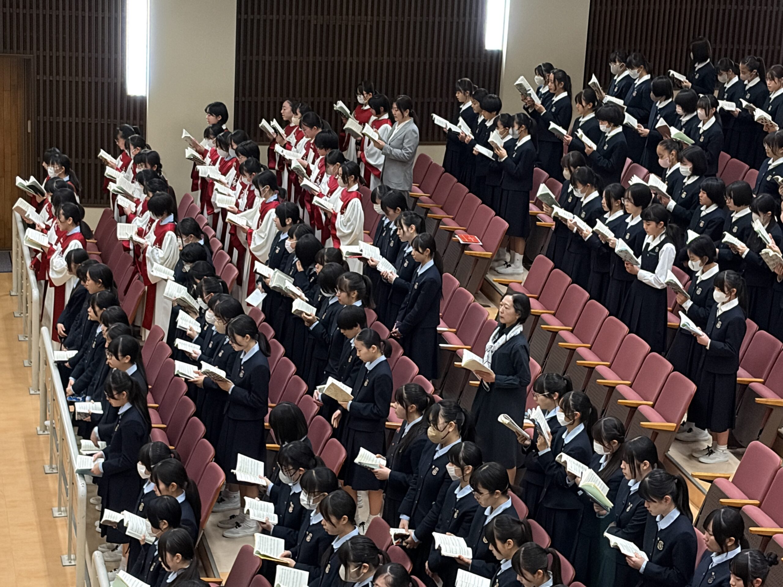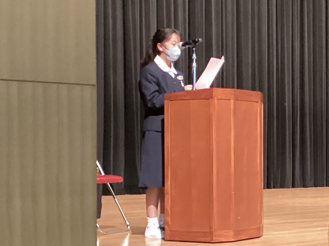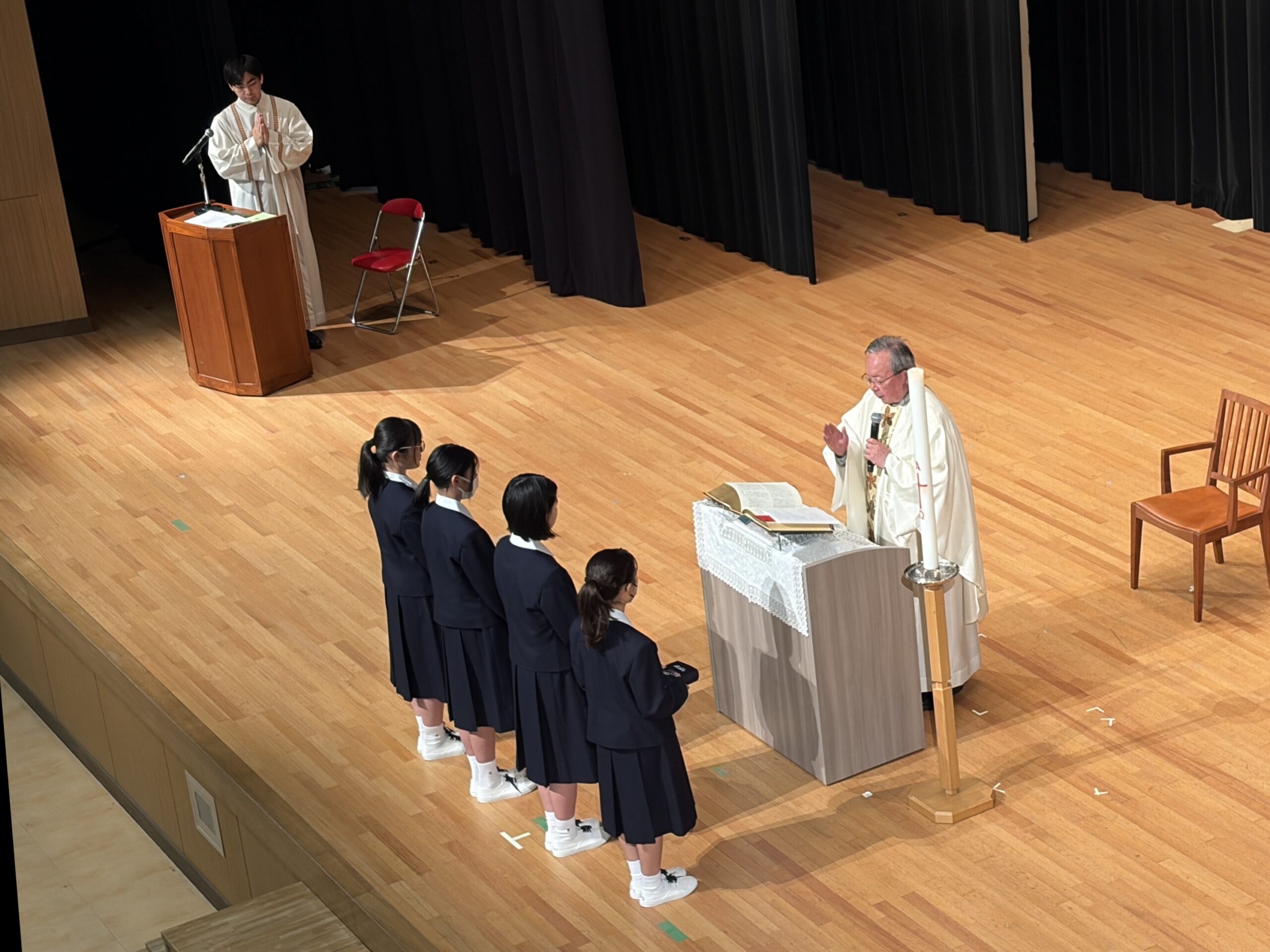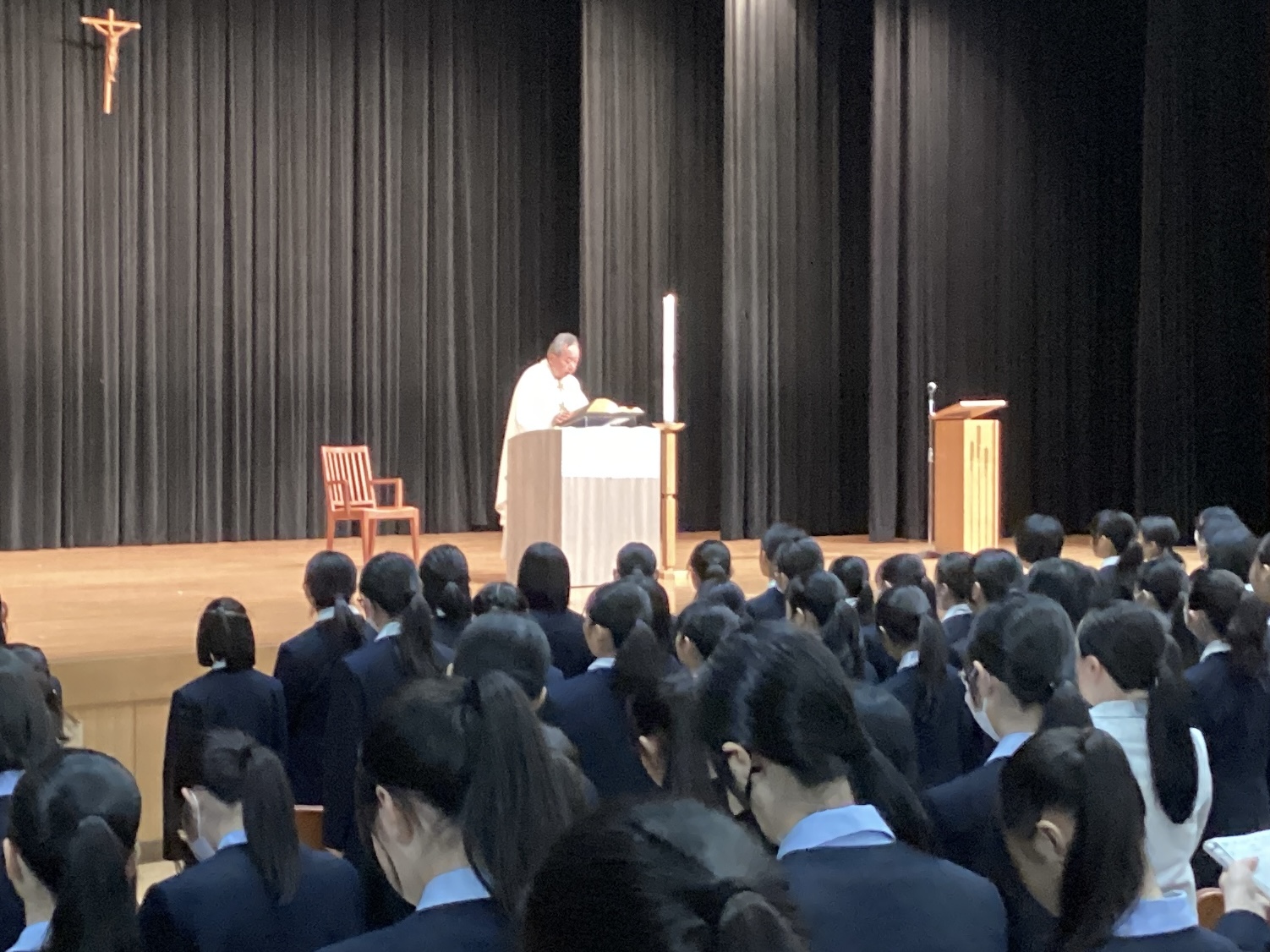 4月17日(金)に、講堂にて、林健久神父様の司式により「み言葉の祭儀」が行われました。「み言葉の祭儀」とは、全校生徒が講堂に集って『聖書』の言葉に耳を傾け、共に祈る大切な時間です。祭壇中央に置かれた大きな『聖書』には、神様の「み言葉」が書かれています。私たちが聖書朗読や神父様のお話に耳を傾け、またこの一年の目標を言葉として述べることを通して、神様との「み言葉」を交わし合っていることを実感し、全校で気持ちを一つにして新年度最初のミサにあずかりました。学年の代表生徒による共同祈願では、新年度を迎えるにあたっての目標を述べ、達成に向けて真摯に歩みを進められるよう、神様にお祈りしました。