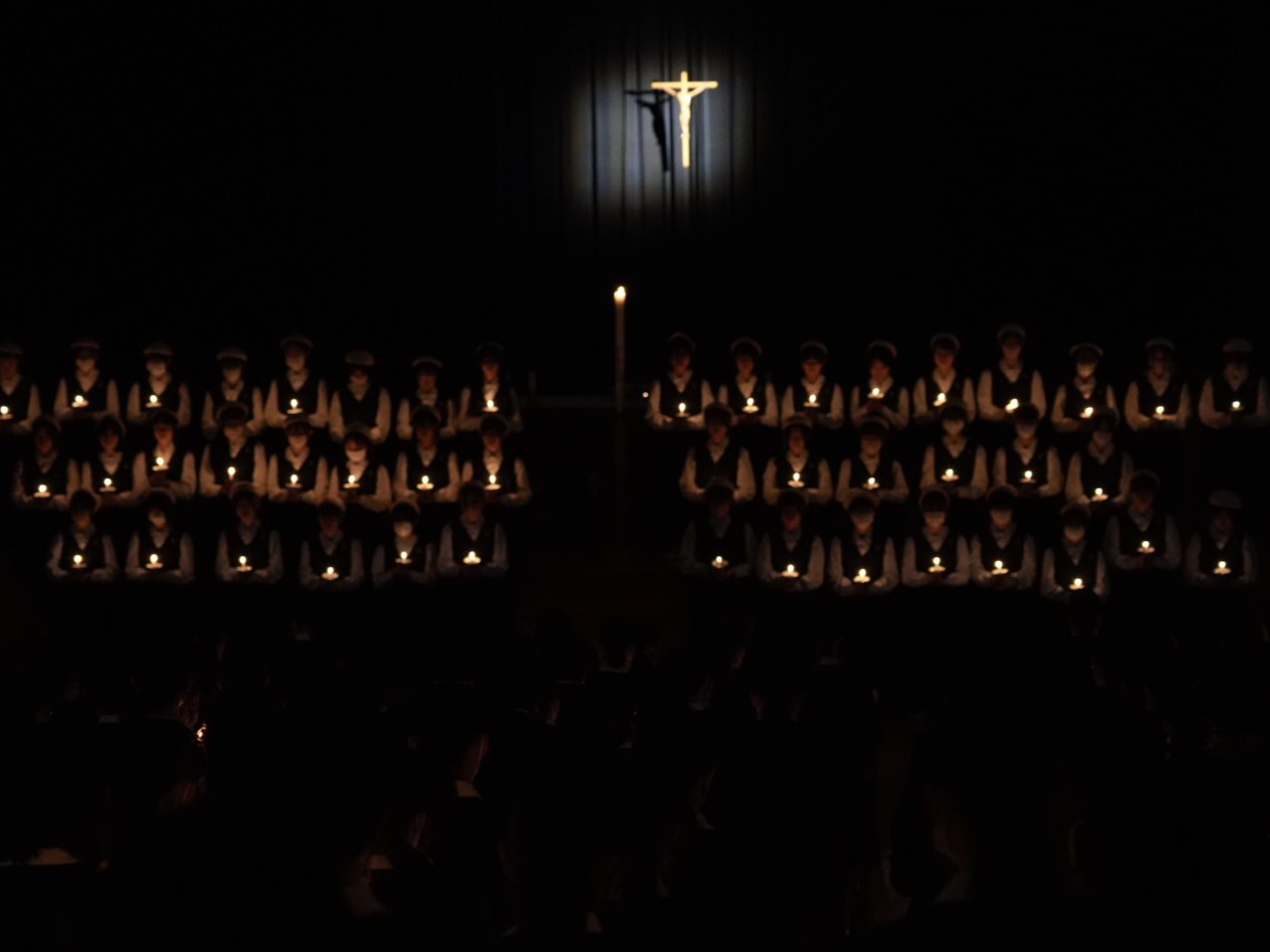 暗い講堂の中で、ひとつの大きなロウソクに火が灯り、その光が隣へ、またその隣へと受け渡されていき、少しずつ全体が明るくなっていく光景が私はとても好きです。
