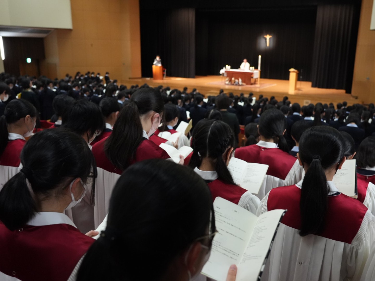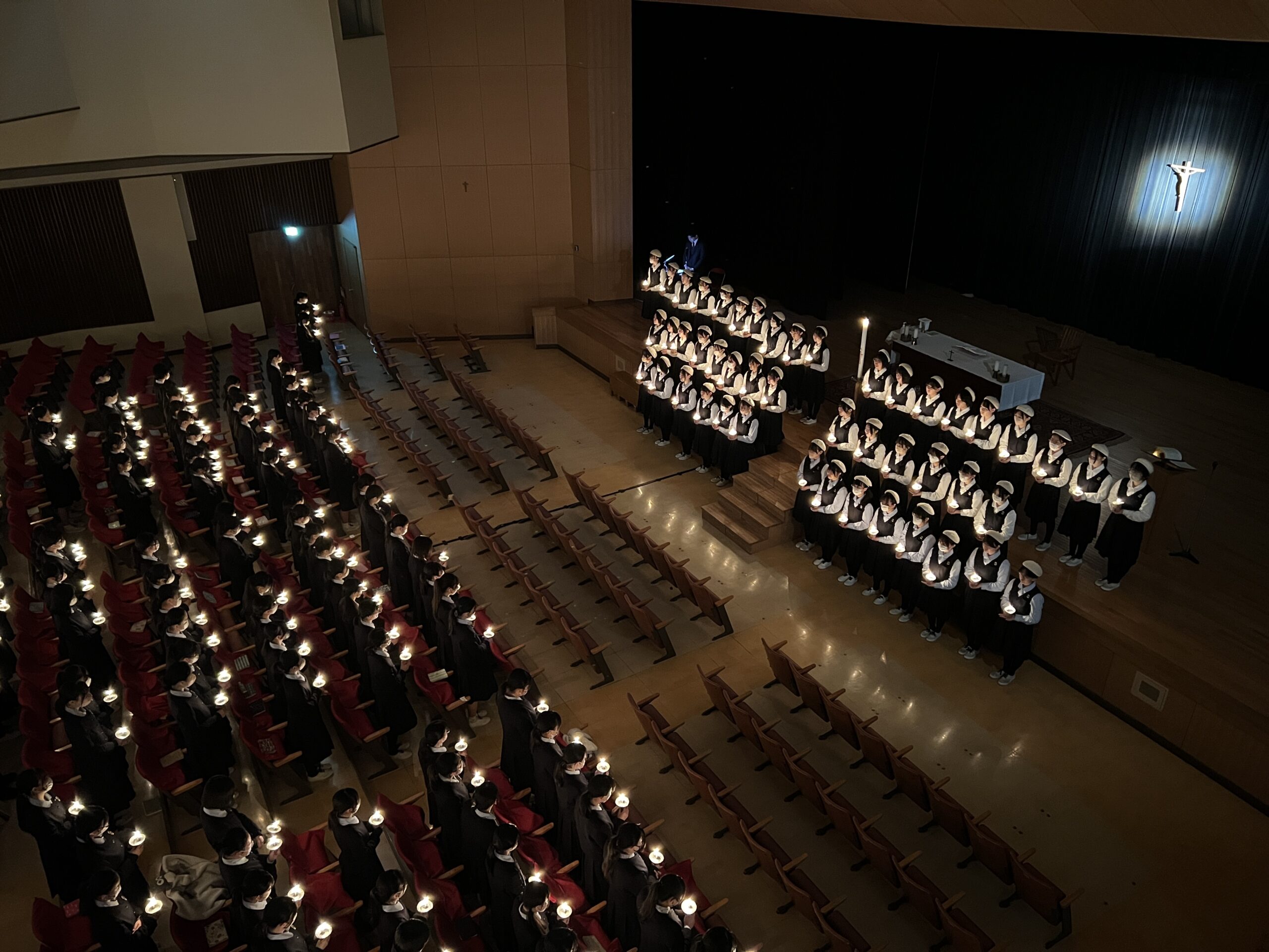 12月19日(金)は、冬休み前最後の登校日でした。午前中は、講堂にて「キャンドルサービス」と「クリスマスミサ」が行われました。キャンドルサービスは、『旧約聖書』のイザヤ書41章10節「恐れるな。わたしはあなたと共にいる」という有名な一節を表しています。講堂内は消灯され、暗闇のような状態になりましたが、これは、私たちの中の迷いや悩み、あるいは社会の混迷を象徴します。また、最初にともされる、壇上中央の大きなキャンドルの炎は幼子イエスを象徴し、そこから私たち一人一人に広がっていく小さな炎は、いつも神様が私たちと共にいて下さっていることを表しています。沈黙の中でのあたたかな連帯感を味わえるこのキャンドルサービスのひと時は、生徒たちのお気に入りの行事の一つとなっています。