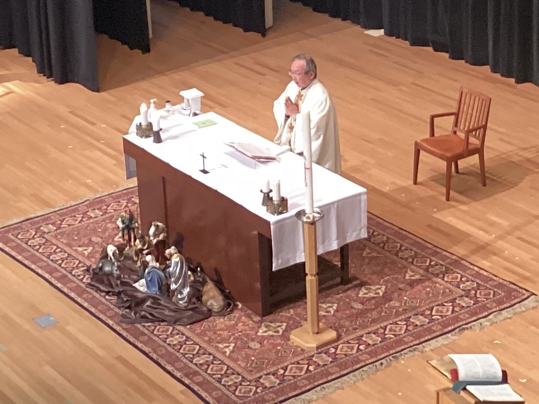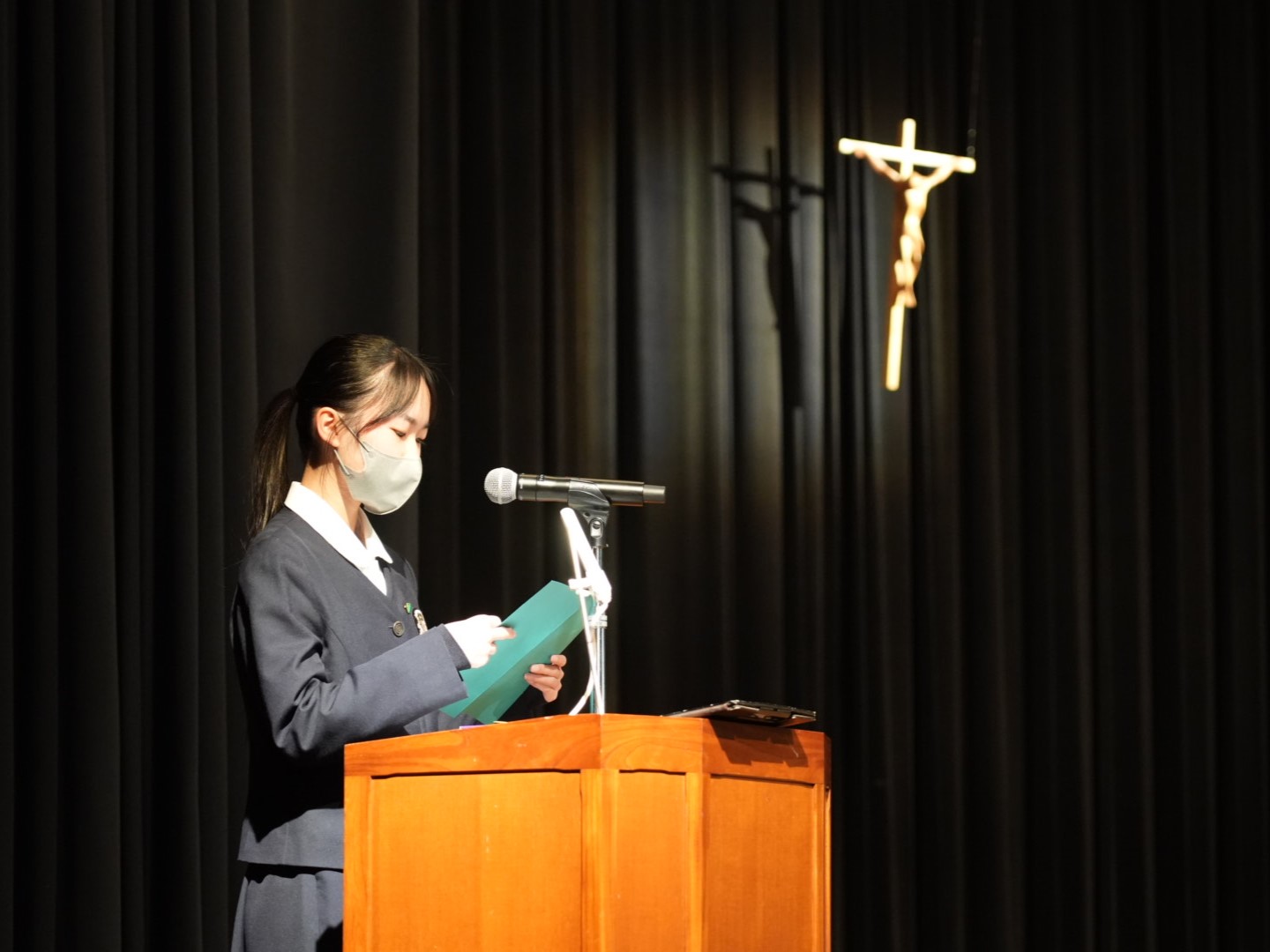 クリスマスミサは本校理事長・校長である林健久神父様の司式で行われました。神父様のお話では、クリスマスの本当の意味について教えて下さった後、「この一年間で周囲の人たちから得たものに感謝しながら、また新しいよき一年を迎えられるようお祈りしましょう」と語られました。共同祈願では各学年、生徒会、教員の代表が、この神父様の言葉に応えるかのように、自分たちの学校生活や宿泊行事を通して成長できたことを述べ、今後もそれぞれの形で努力し続けることができるように祈りました。
