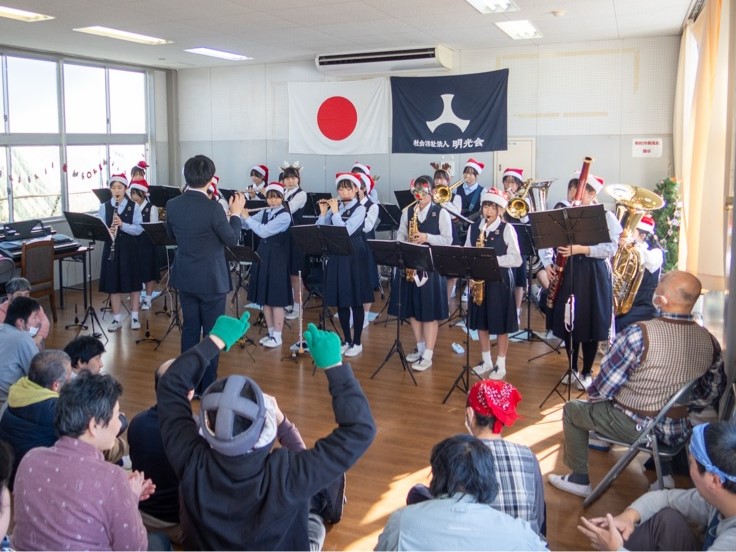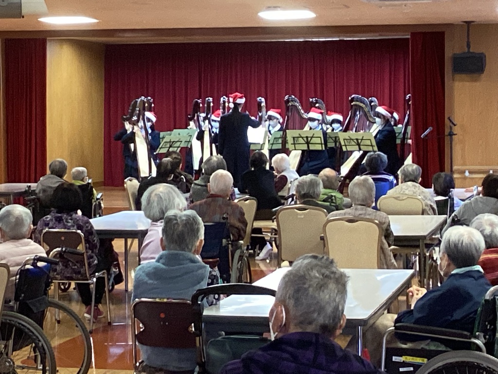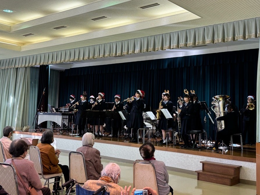 吹奏楽部は2グループに分かれて訪問しました。こちらは老人ホーム「楽寿の園」の訪問でのミニコンサートの様子です。クリスマスの曲や、日本の唱歌を演奏しました。