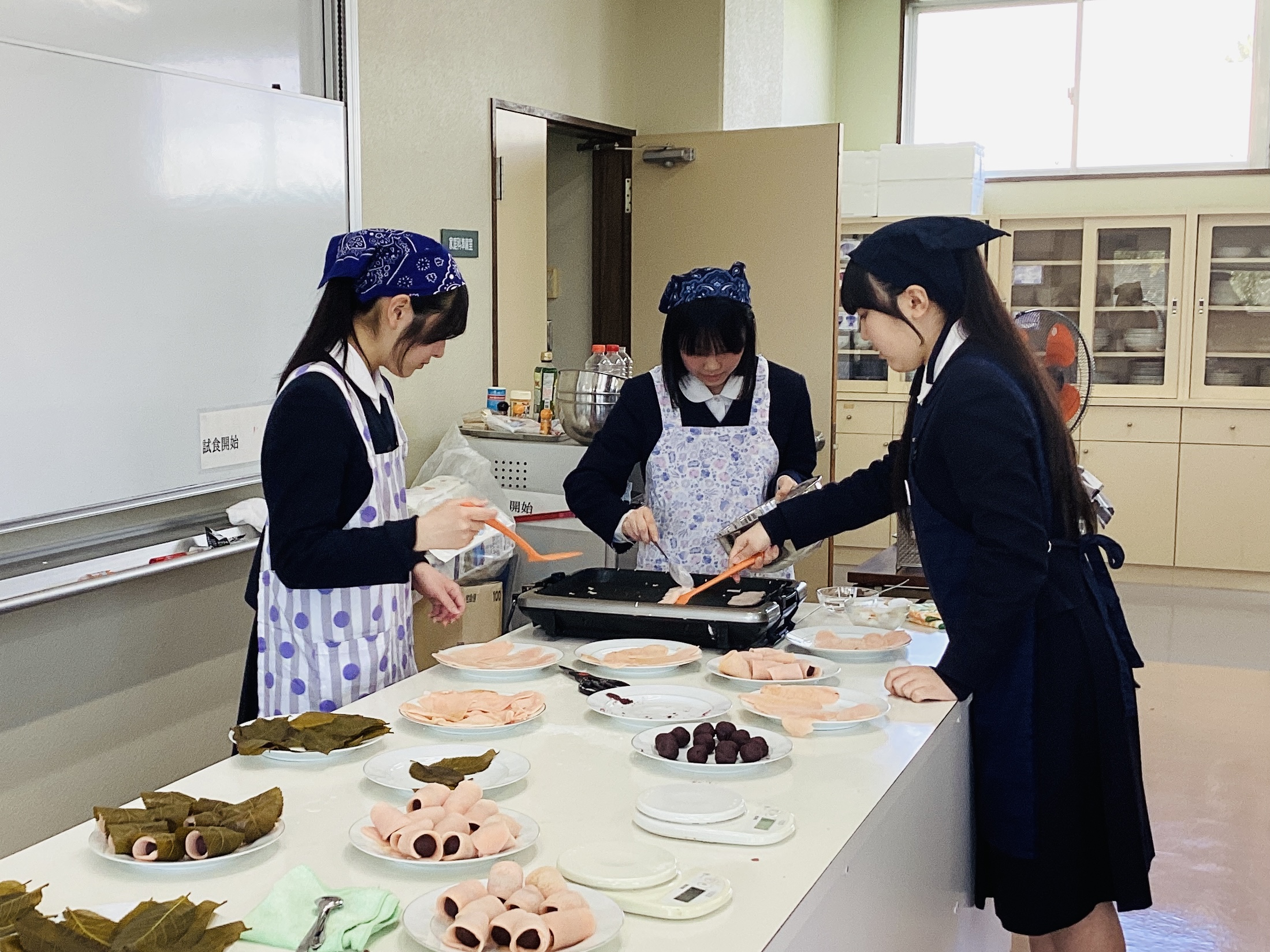 今回の実習で作ったお弁当は、主食のちらし寿司に、おかずは「筑前煮」と「青菜ともやしの胡麻和え」、デザートに「関東風桜餅」が添えられています。グループごとに一品ずつ調理を行い、最後にお弁当の容器に詰めていき、お世話になった先生方にお届けしました。材料を切る、焼く、炒める、見栄えよく盛り付ける…という、この3年間の家庭科の授業を通して身につけてきた調理技術を駆使して作ったお弁当は、栄養も愛情もたっぷりで、中学校生活での調理実習のよい締めくくりになりました。