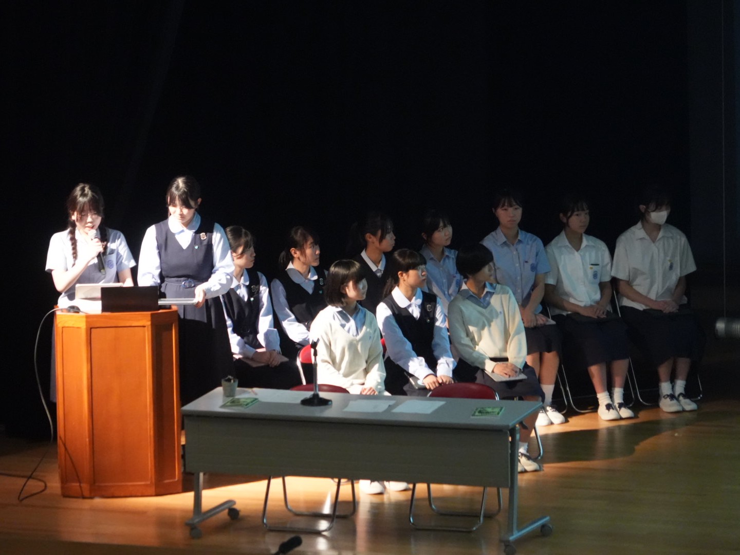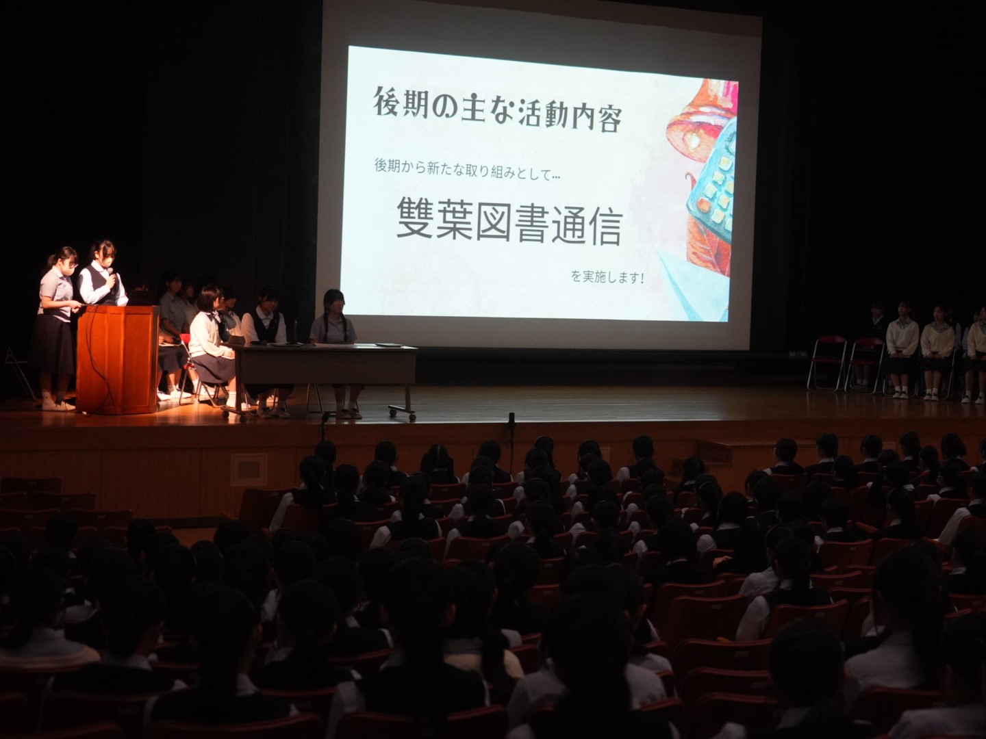 10月15日(水)の放課後、講堂で「後期生徒総会」が行われました。各常任委員会・生徒会・フォスターフレンドの代表が、後期の活動内容について発表しました。前期から引き継ぐ活動、新たに始める活動をそれぞれわかりやすく説明し、全校生徒に知ってもらうよい機会になりました。