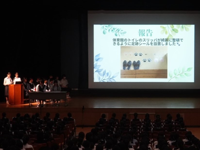 整美委員会の発表の様子。体育館のトイレのスリッパを整頓する工夫として「足跡シール」を設置したそうです。