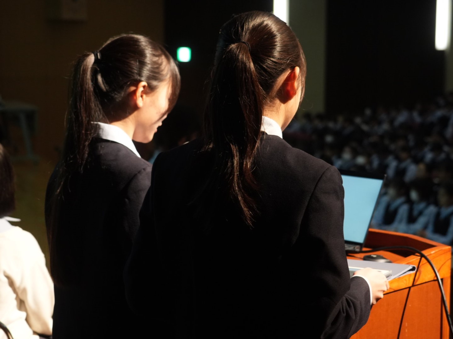 壇上からは全校生徒が見渡せます。限られた時間の中、どの学年にも効果的に内容が伝わるよう、スライドや発表原稿も工夫して準備してきました。