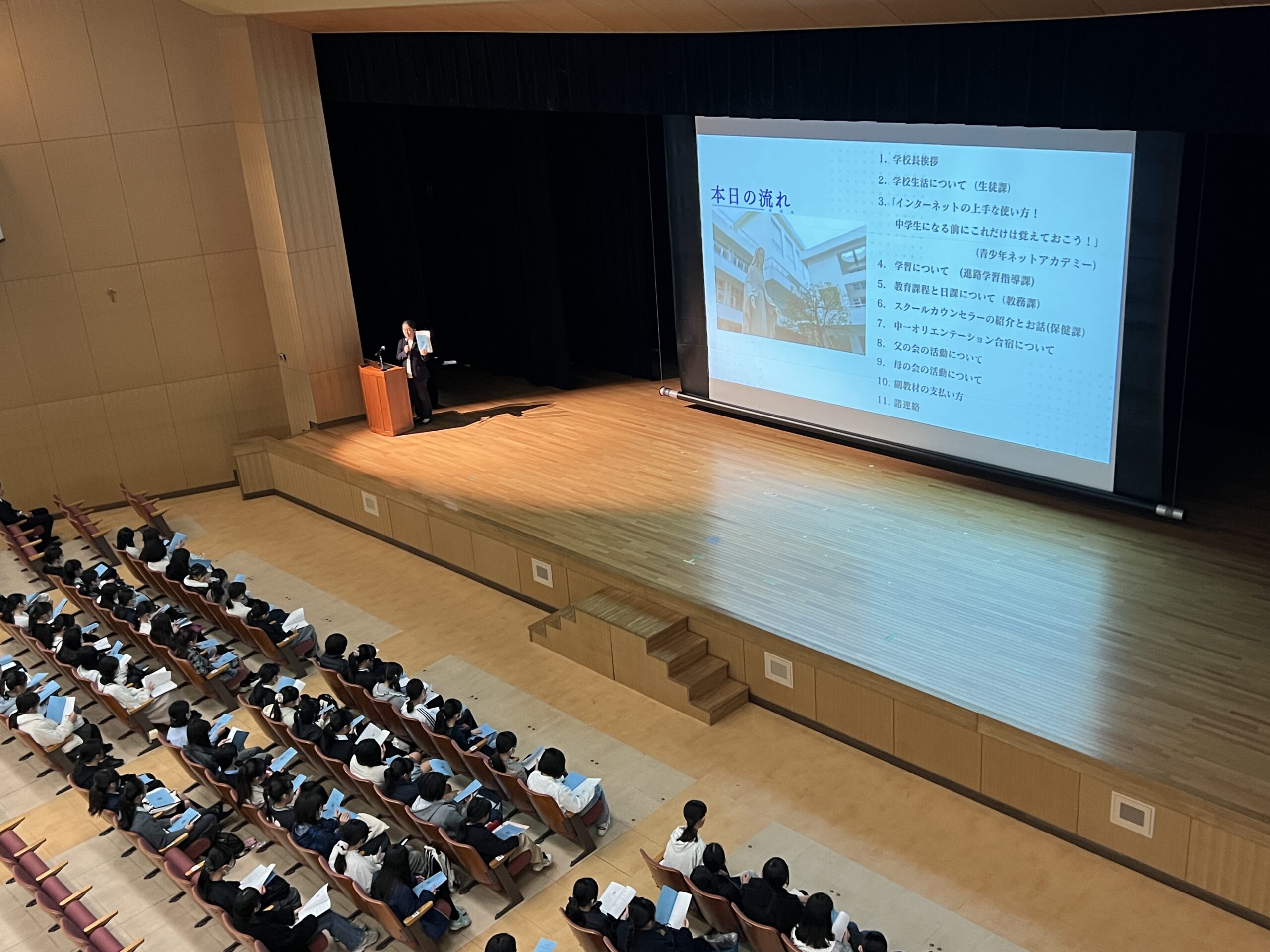 3月25日(水)午後に、講堂で「新中一オリエンテーション」が行われました。校長先生の挨拶の後、生徒課から「学校生活について」、進路学習指導課から「学習について」、その他にも教務課から「日課・カリキュラムについて」など、学校生活に関する様々な説明がありました。