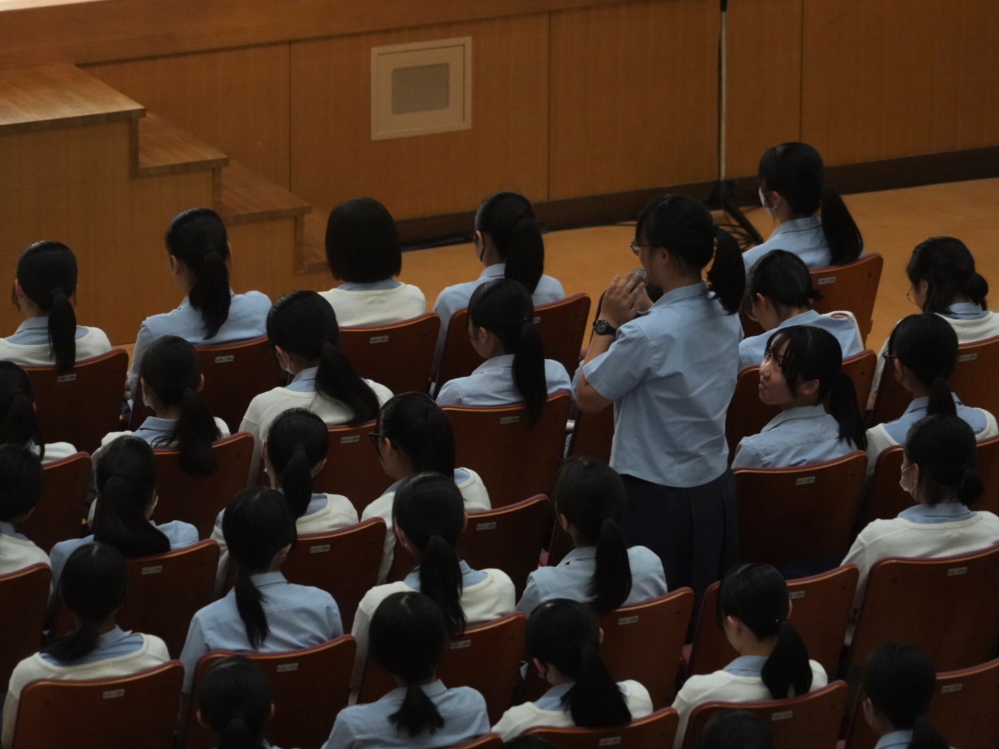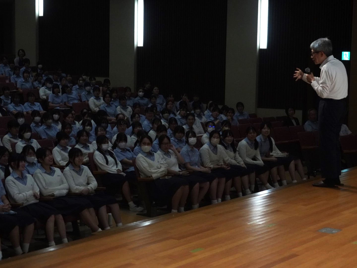 「コミュニケーション能力」という言葉が近年取り上げられていますが、実際のところはそういった固定的な能力は存在せず、国や文化によって求められるコミュニケーションが異なるという、「コミュニケーションの多様性」を理解することが大切だと教えていただきました。相手が発した言葉の表面だけではなく、その言葉を裏付ける相手の文化や感情といった背景すなわち「コンテクスト」を理解することは、人間にしかできない大切なコミュニケーションの形であり、それは過去のデータのみに基づく判断をするコンピューターとは一線を画する部分だということがわかりました。平田氏の講演のこの部分は、特に高3生にとっては、6月に行われた「黙想会」での神父様のお話と重なる部分があり、より説得力を持って生徒たちの心の中に入っていったと思います。