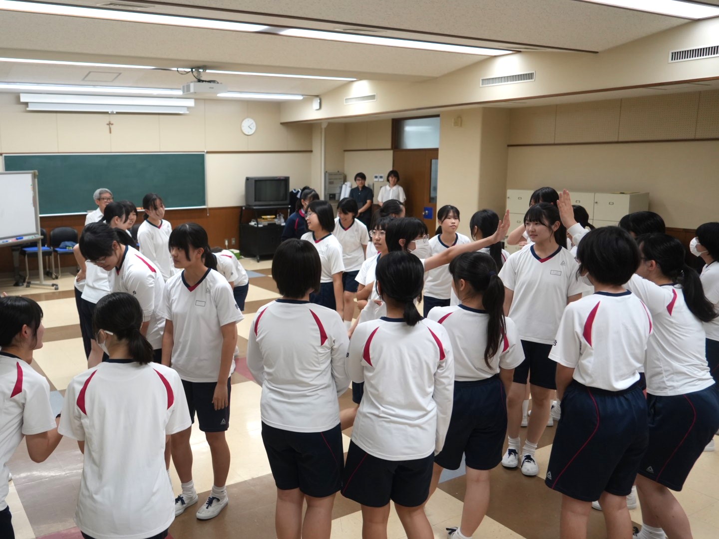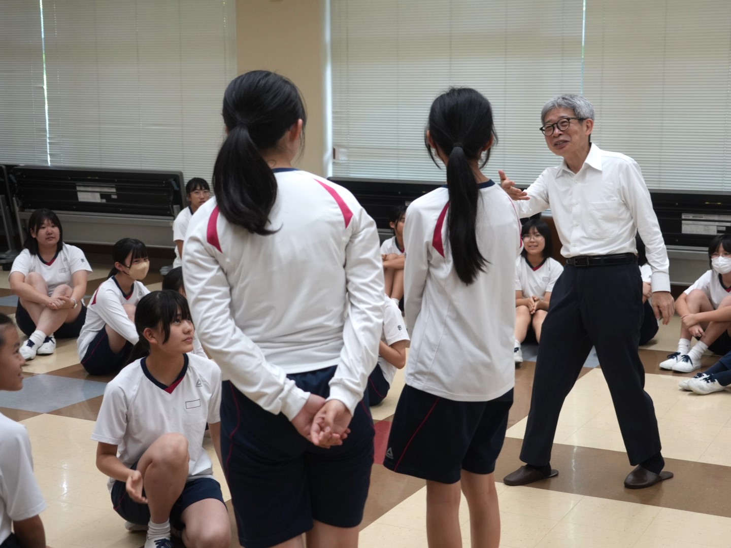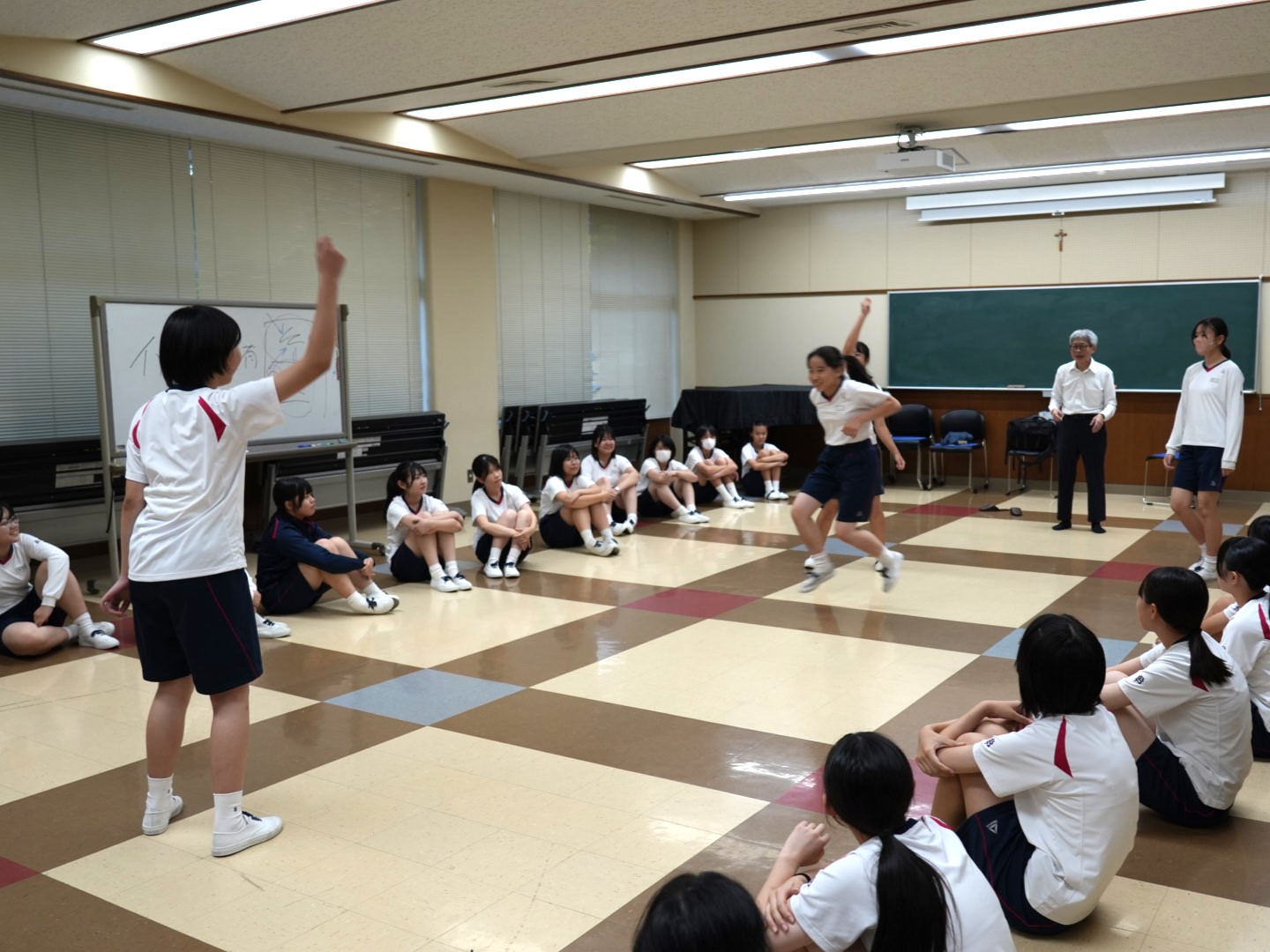 講演会の後、中1から高3までの希望者約30名が、平田氏によるワークショップに参加しました。心・身体・言葉の繋がりを意識したエクササイズをいくつか行い、中学生も高校生もまさに「対話」を繰り返しながら、お互いの感覚の「ずれ」を実感しながらも、それらを「共有」していくことができました。終始笑いが絶えず、和やかで有意義な時間でした。