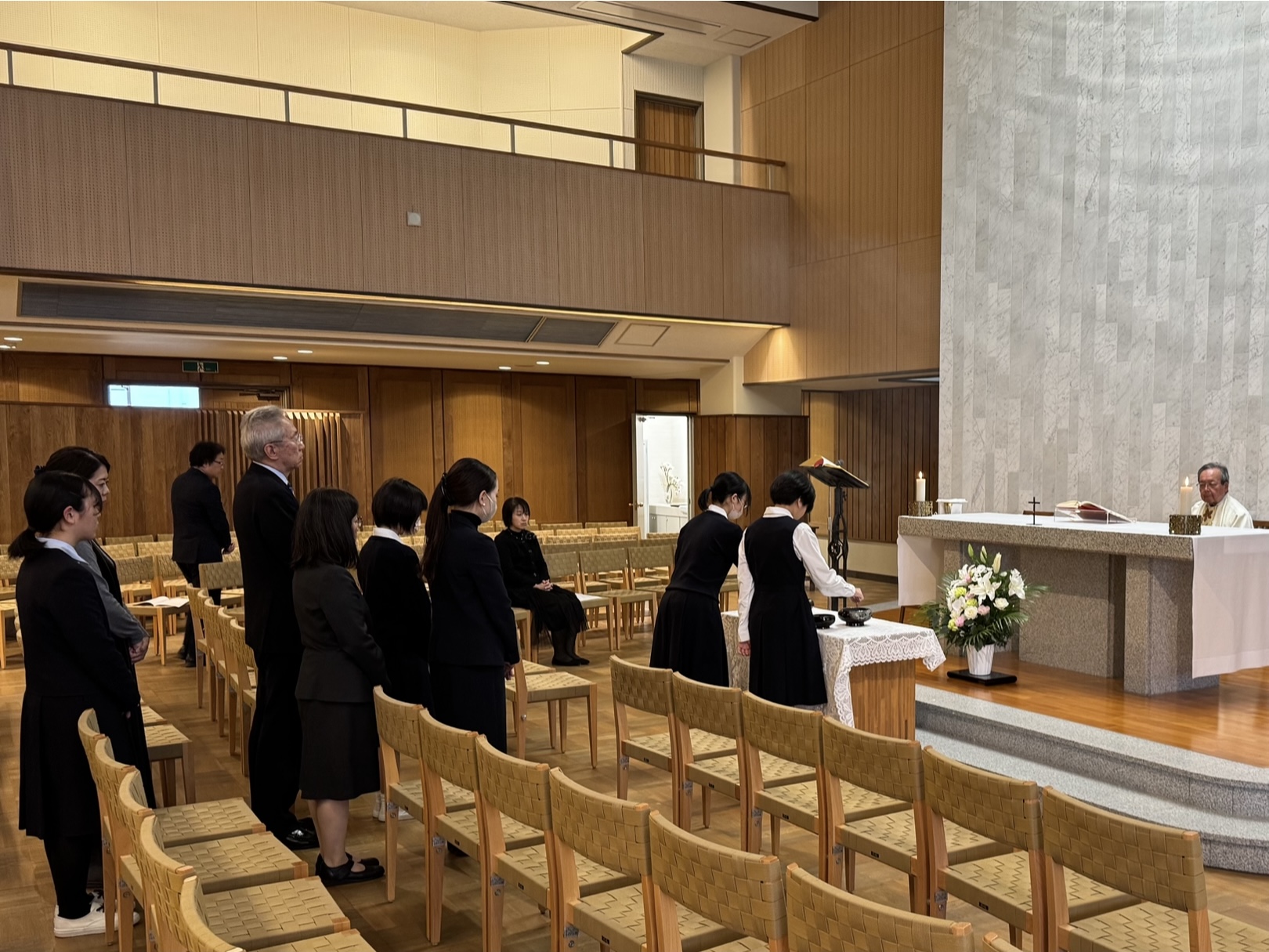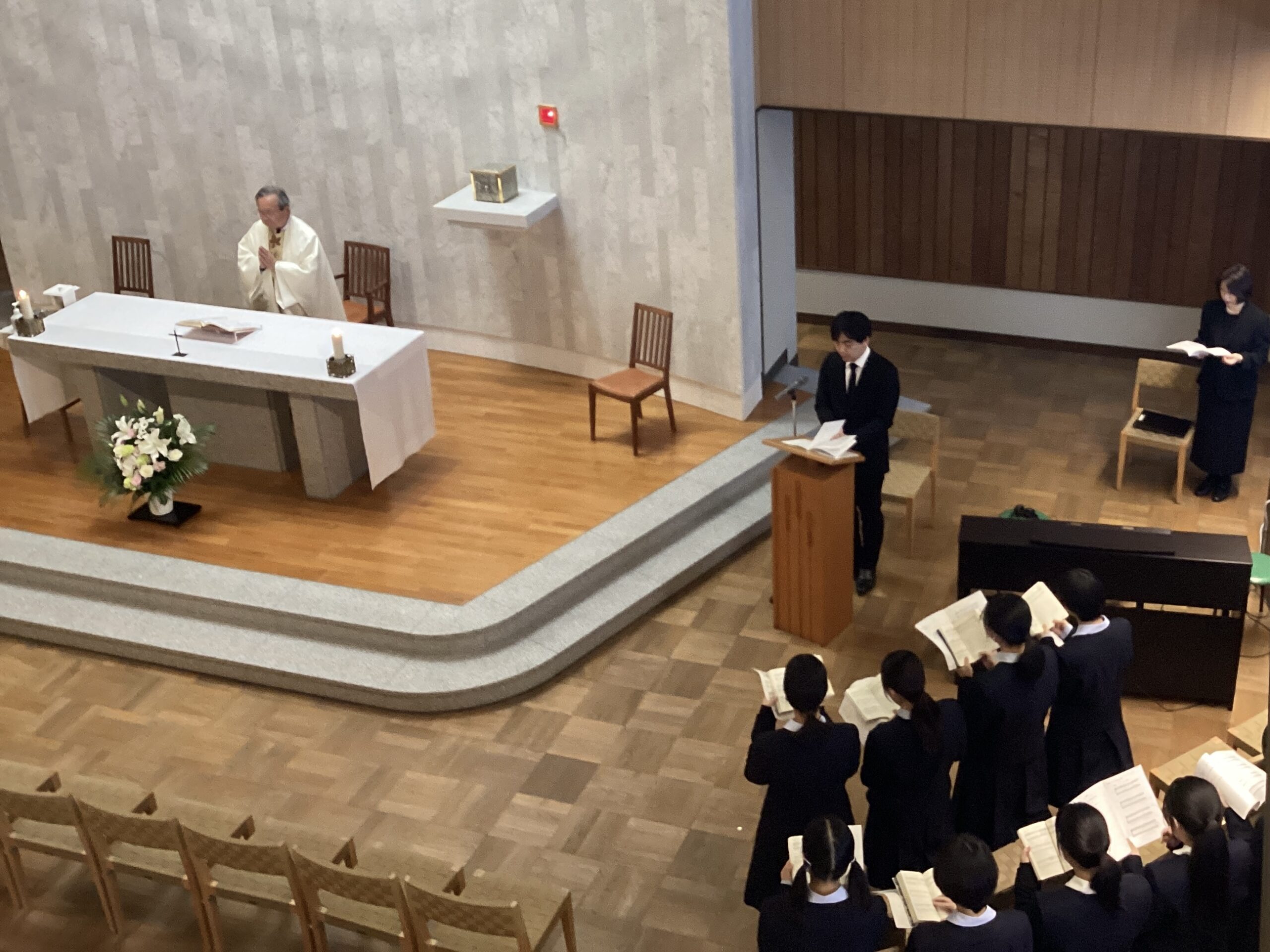 カトリック教会では、11月を「死者の月」として亡くなられた方を偲び、祈りを捧げる習慣があります。本校では、11月29日(土)の午後に、カトリック司祭である理事長・校長 林 健久の司式により、この一年で亡くなられた学園関係者や生徒の身の周りの大切な方々のために御ミサを捧げました。御ミサの中では、亡くなられた方々のお名前を読み上げ、参列した教員・生徒、生徒のご家族が心を合わせて、神のみもとでのご幸福をお祈りいたしました。