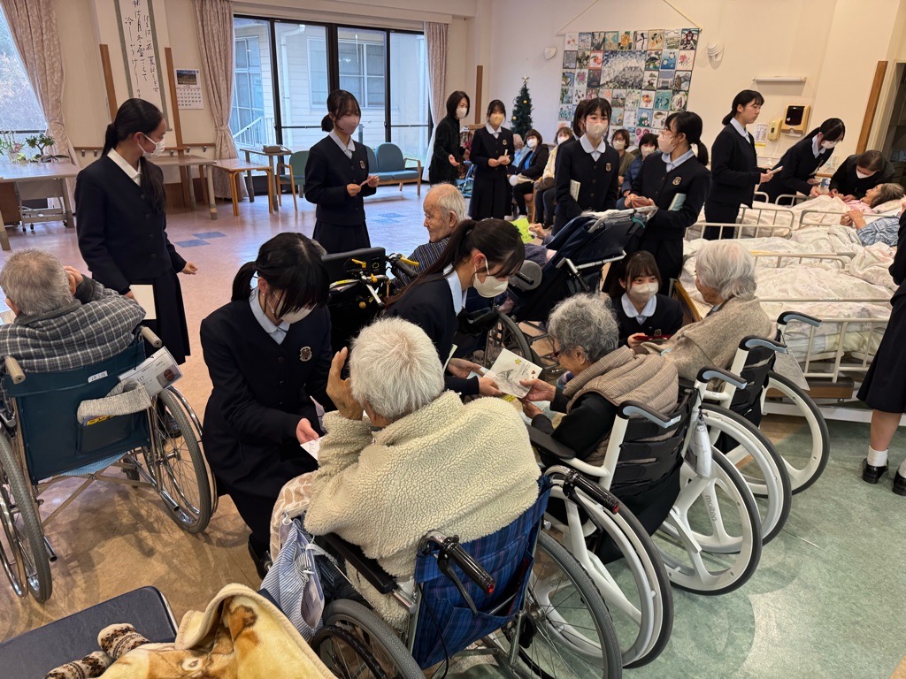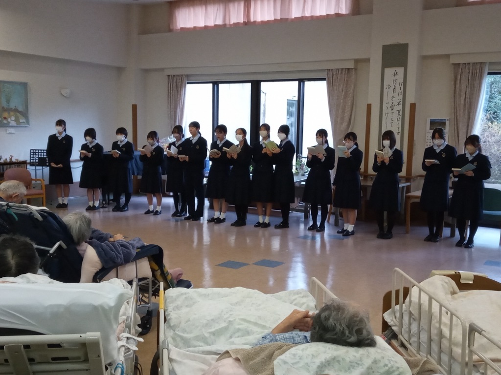 午前中は、ハンセン病患者の方々や創立者テストウィド神父、井深八重さんらの眠る墓地を参って献花し、全国初のハンセン病療養所として我が国のカトリック再宣教の草創期を支えた人々について知り、思いを馳せました。午後は現在運営を担うクリストロア会のシスターに迎えられ、復生記念館で病院の歴史を学び、ホスピスと介護医療院に入院される皆さまへのキャロリング(聖歌を歌いながら巡回すること)を行いました。現在施設に2名のみとなった元ハンセン病患者の藤原さんも、生徒の歌うクリスマス聖歌をお聴きくださいました。