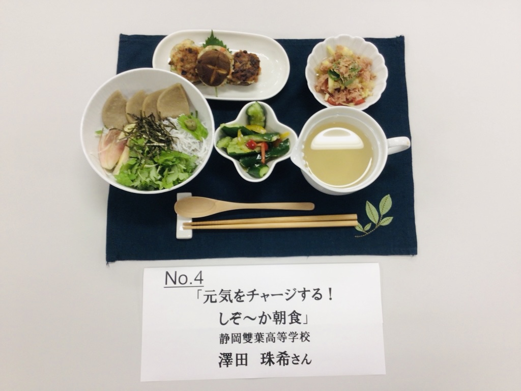 私は幼い頃から食べることも料理することも好きで、将来は栄養系の道に進みたいと考えているため、その第一歩としてこのコンテストに挑戦しました。「アレルギーの心配が少ない『和食の素材を使った朝ごはん』」というテーマを受けて、私の地元である焼津市特産の黒はんぺんの出汁を使った、さらさらと食べやすい「冷やし出汁茶漬け」を考案し、出汁の味わいを楽しんでもらうために「かつお出汁を使ったトマトのマリネ」を考案し、あとはアレルギーの少ない、地元の食材で彩りも考えながらメニューを決定しました。