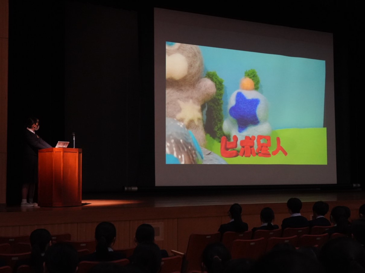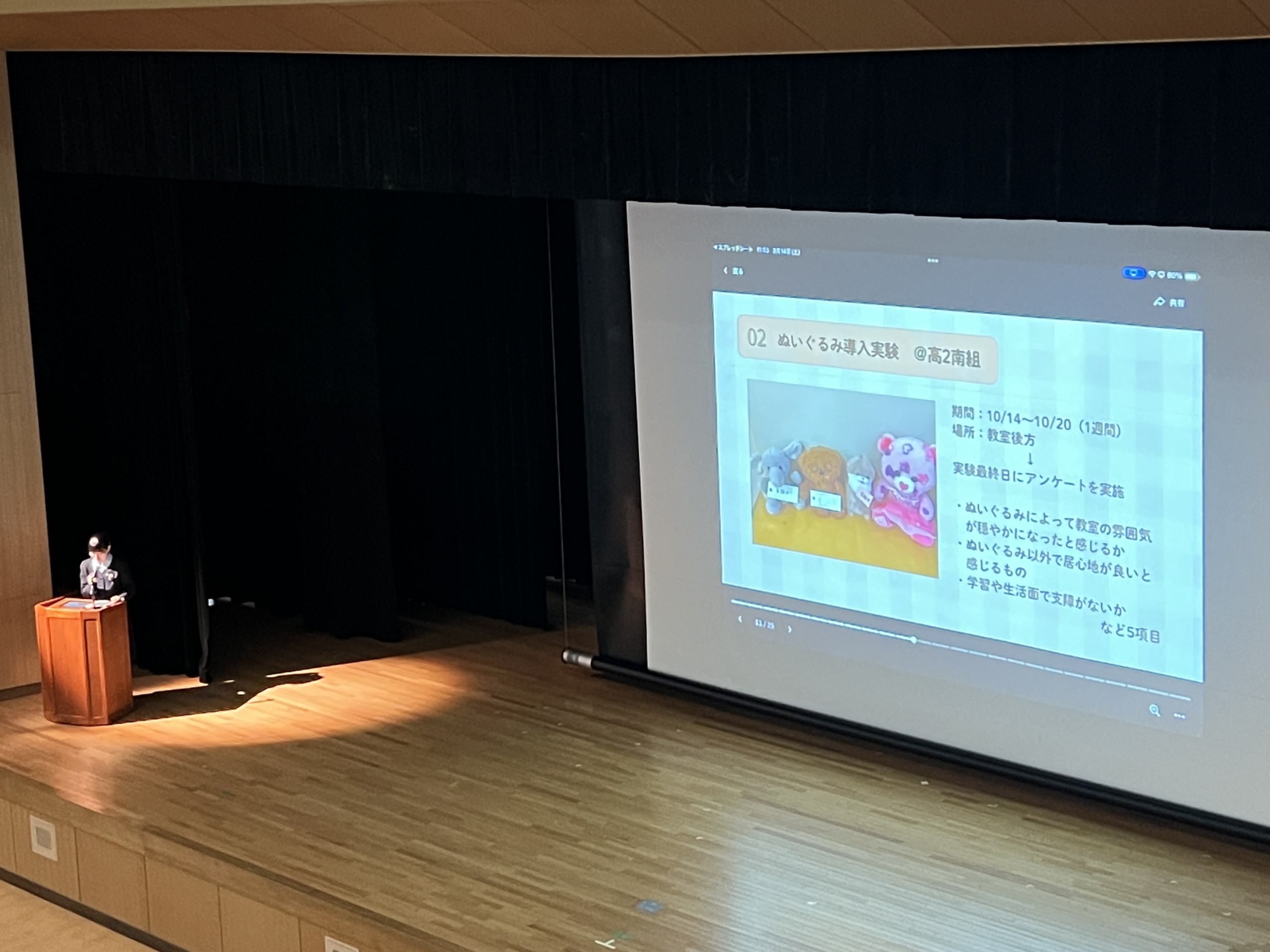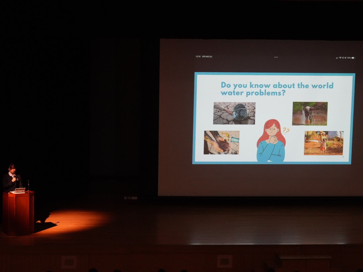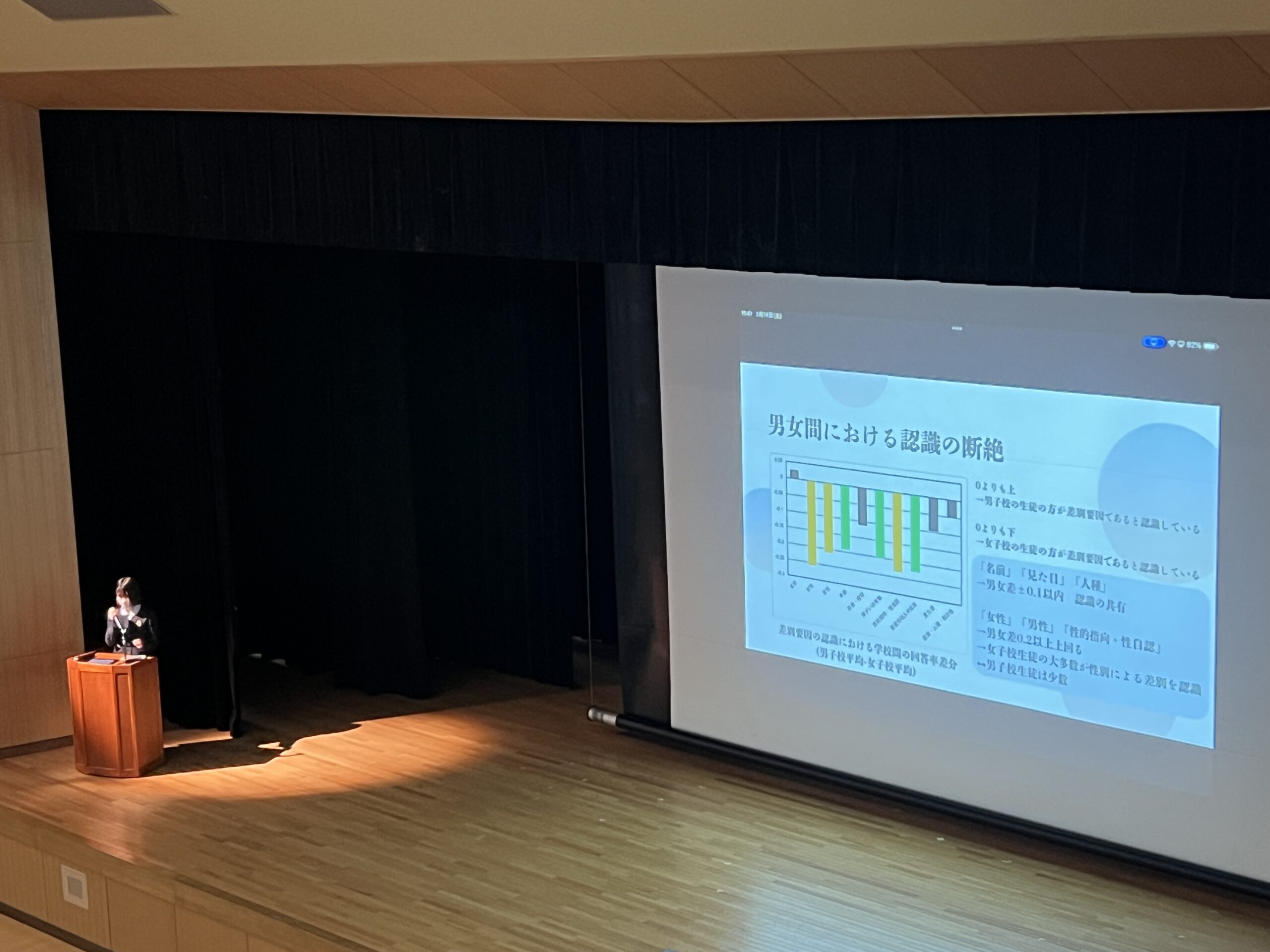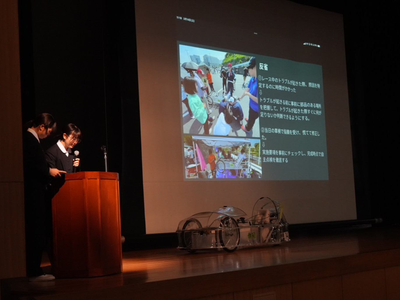 生命科学コース「静岡産ホタルの駿府城公園周辺での定着を目指して」の発表。ホタルの保護を目指して、実際に幼虫やその餌となるカワニナを飼育したり、さまざまな勉強会に参加したりしました。生命科学コース「ボール投げの記録を伸ばそう」の発表。実際に運動部員にボール投げをしてもらった動画。飛んだ場合と飛ばない場合のフォームを分析し、映像やグラフを用いて説明しました。科学技術コース「入眠用BGM作成」の発表。Garagebandというアプリを用い、音響設計理論に基づいて、脳を休息状態にするBGMを作ったそうです。「1/fゆらぎ」(規則性と不規則性を取り混ぜた音の流れ)や、自然音(波の音)を取り入れました。科学技術コース「フェルト人形を使ったコマ撮りアニメーション」の発表。幼いころからテレビのコマ撮りアニメに親しんできた経験から、自作を考えたとのこと。手作りのフェルト人形のキャラクターが3体登場し、それぞれ名前と性格があるそうです。科学技術コース「VICTORIA 電気自動車の設計と製作」の発表。実際に製作した車体(写真中央)に乗って登場し、製作過程での工夫や苦労、大会出場の様子も説明しました。社会科学コース「潜在的な差別・偏見の原因とは」の発表。「潜在的なステレオタイプの形成」に関する調査では、「サッカー」「ピンク」などの単語から想起される性別について、調査対象の女子校・男子校の別、さらに学年別に結果を分析しました。社会科学コース「学校へのぬいぐるみの導入による居心地の良さの向上」の発表。全国でぬいぐるみを導入した学校への取材の様子や、自分の所属するクラスでの導入実験の結果などを説明しました。国際教養コース「Peace. Let’s Make It Happen!」の発表。世界の紛争や災害に苦しむ子どもたちを救うために、私たち学生には何ができるかをプレゼンテーションしました。本校の活動例としては月例献金や、フォスターフレンドの活動を挙げました。国際教養コース「How Can We Supply Safe Water to People around the World?」の発表。世界の水問題について取り上げ、限りある資源である水を効果的に使える水栓の紹介や、私たち学生にできることを説明しました。質疑応答の様子。写真は、国際教養コースの発表の時のものです。英語で質問し、英語で答えるやりとりもありました。