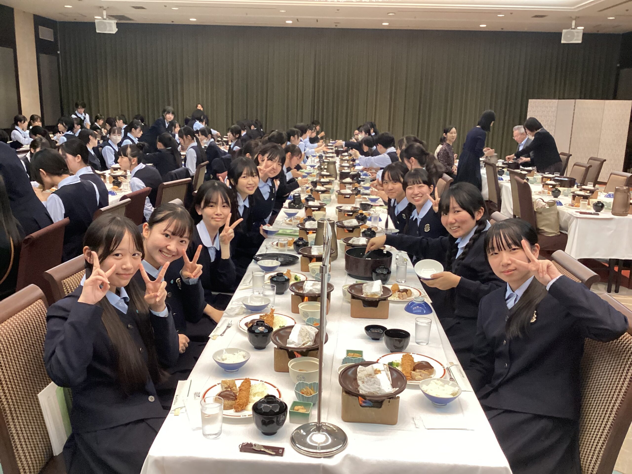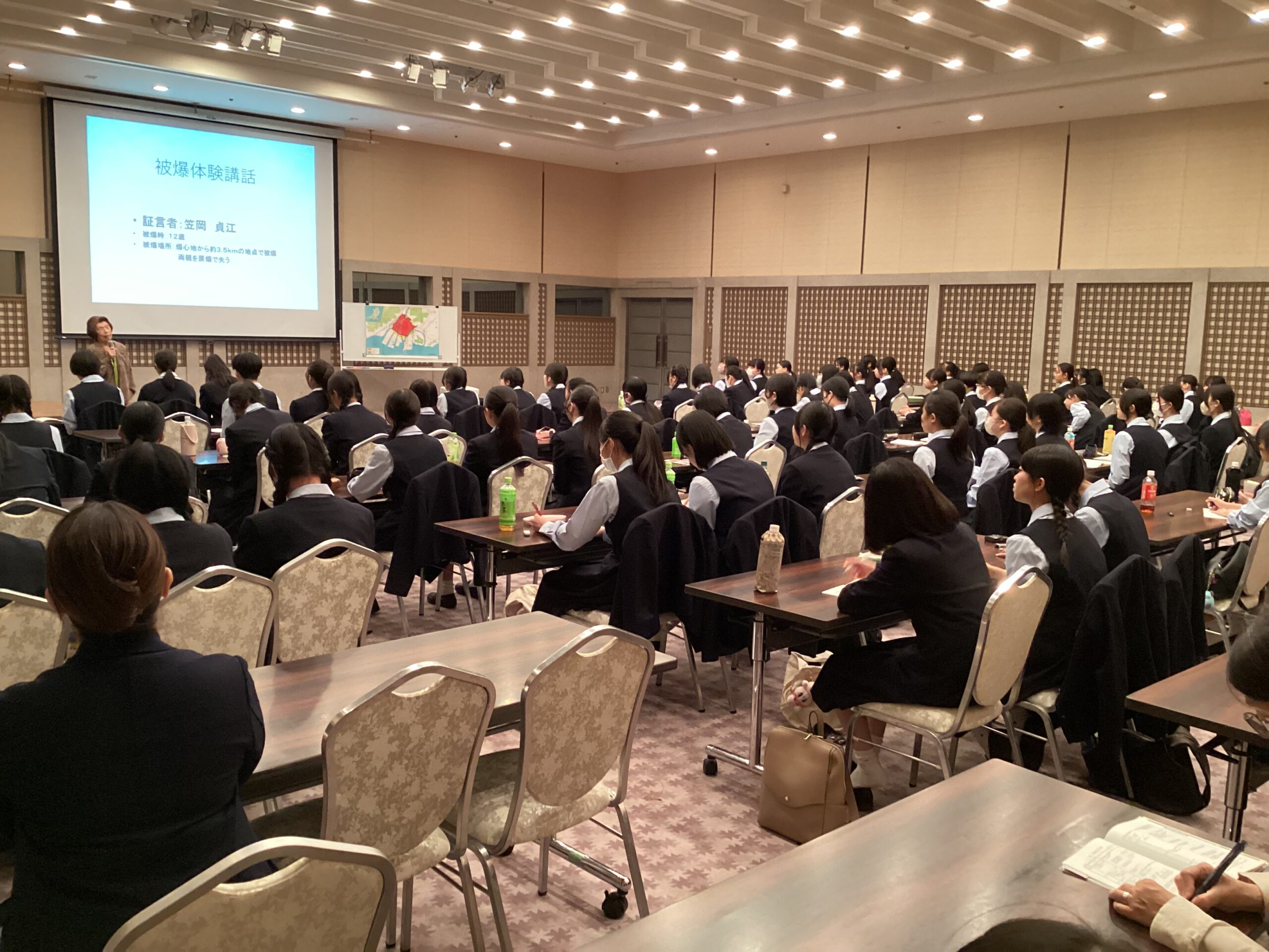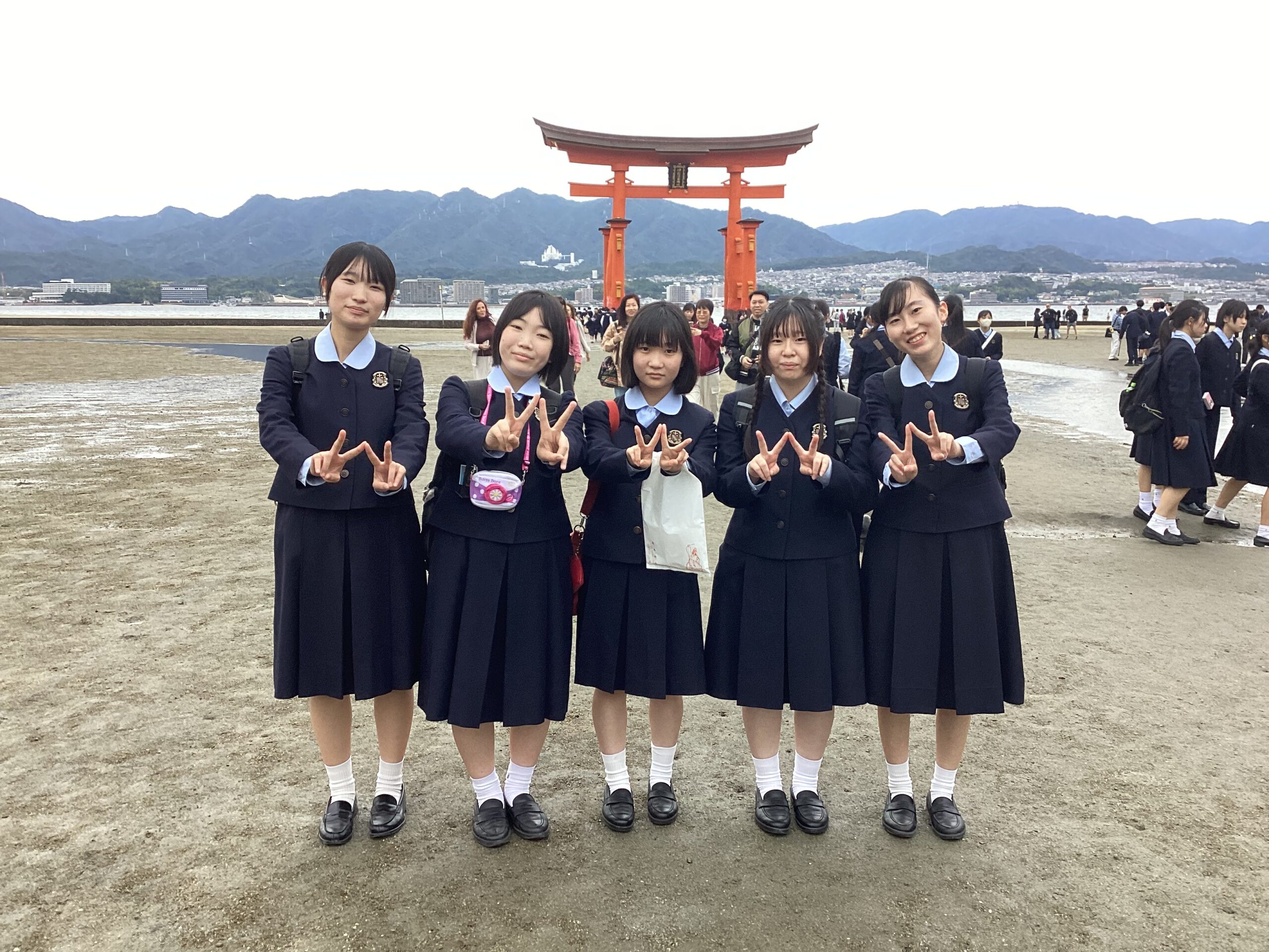 原爆資料館での平和講話では、被爆者である笠岡貞江さんのお話を書き留めながら、真剣に伺っていました。92才の笠岡さんが最後におっしゃった「頑張ってね」という未来を歩む生徒たちへのエールを、しっかり受け止めていました。宮島では、班ごとで鳥居を背景に写真を撮ったり、もみじまんじょうを食べたりと楽しそうな笑顔が見られました。