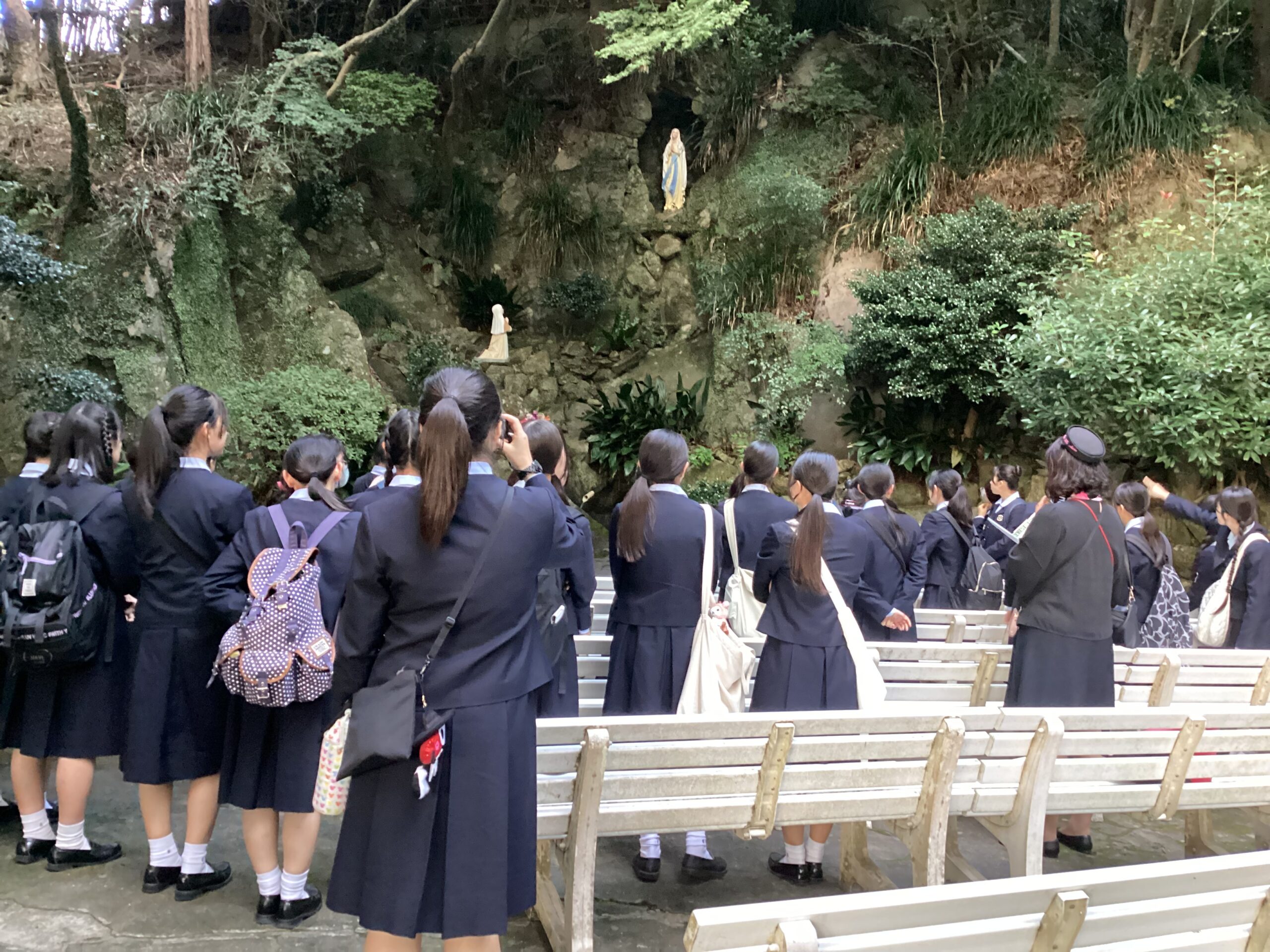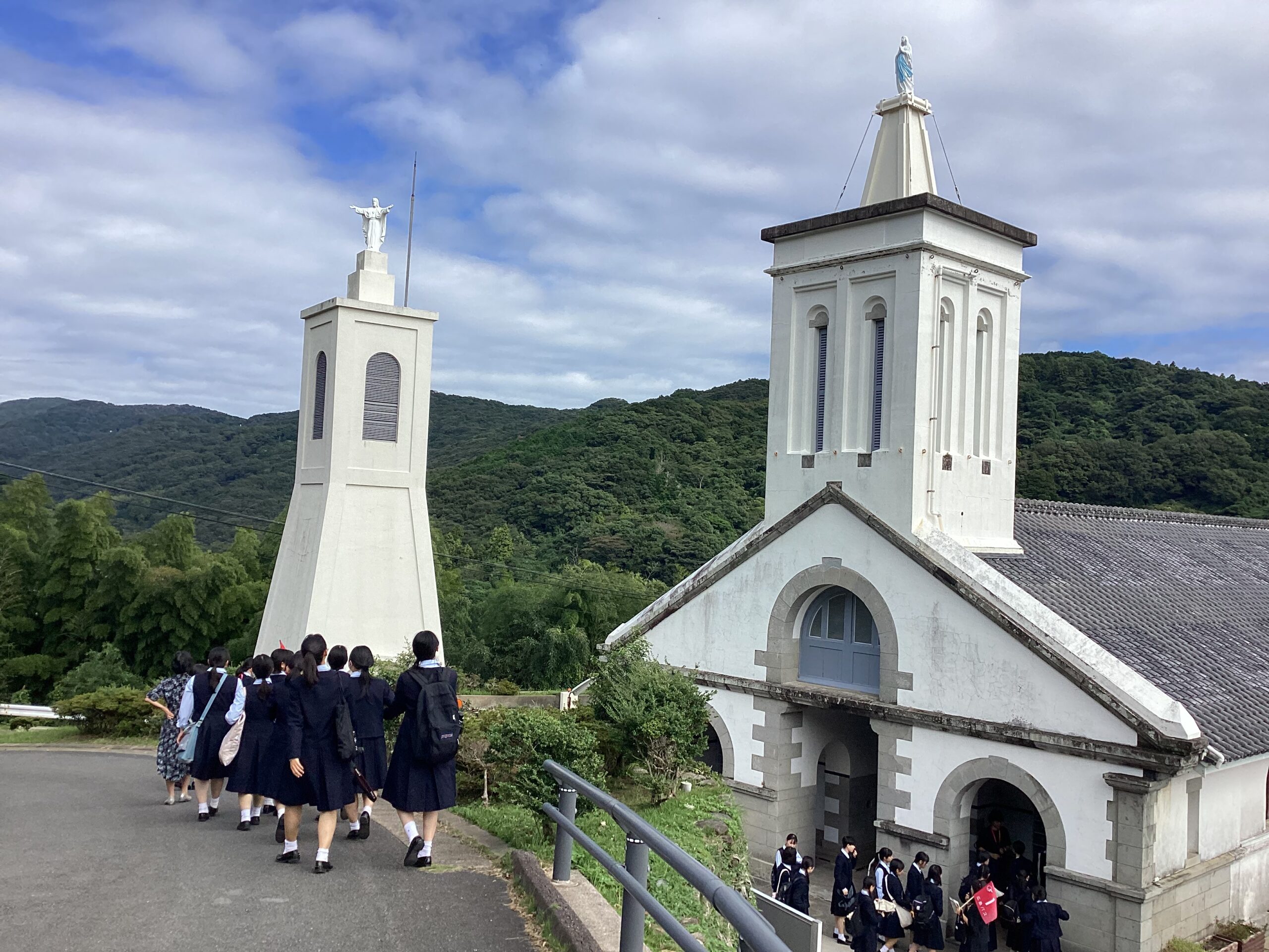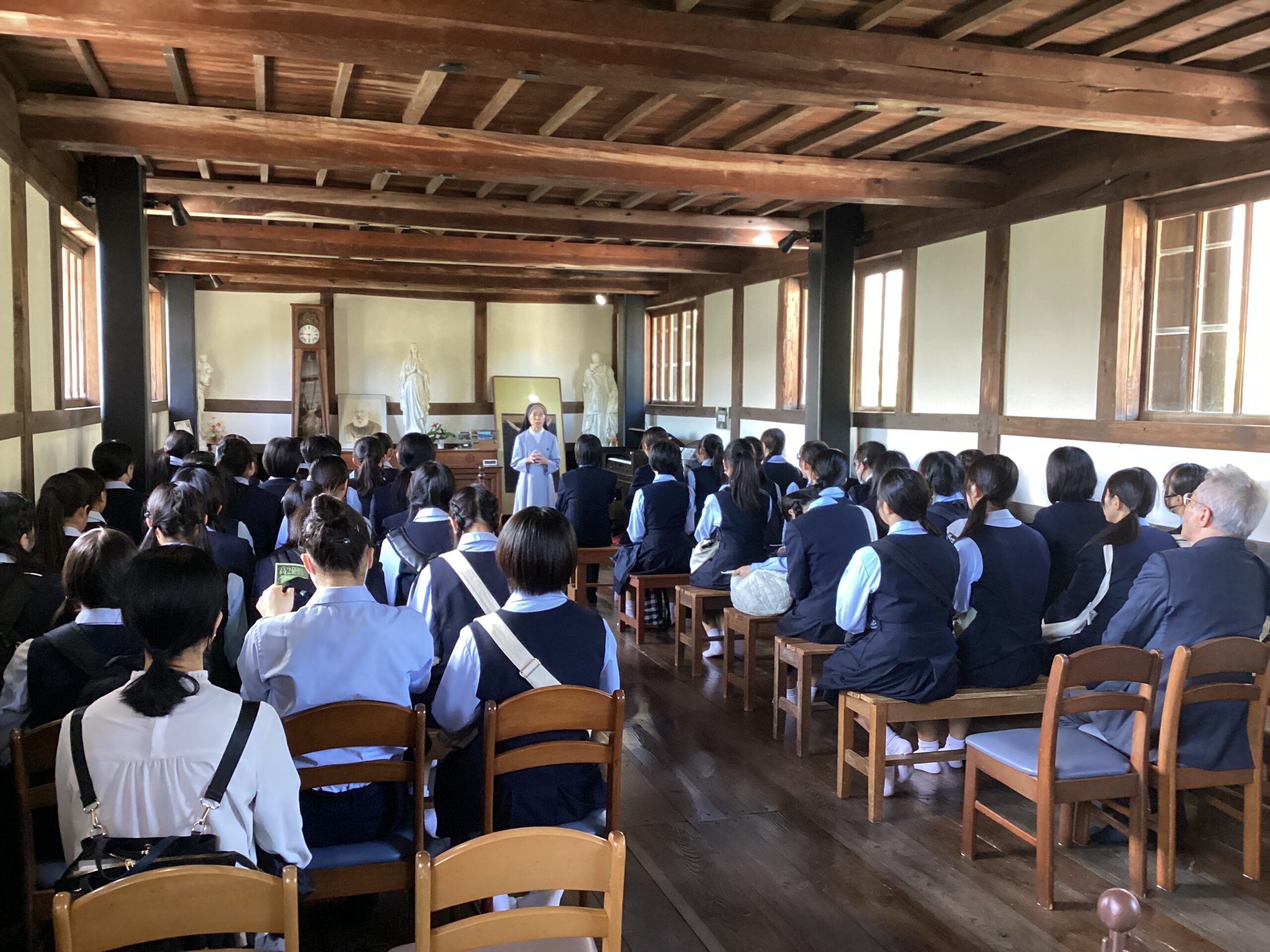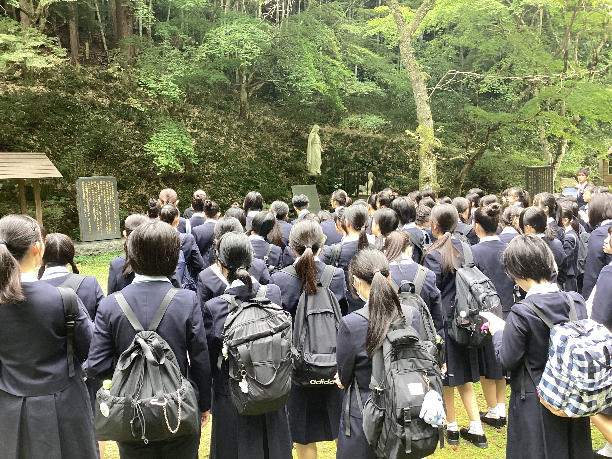 津和野では、15分ほど田舎道と山道を進み、乙女峠で津和野カトリック教会の山根神父様よりお話を伺いました。津和野での殉教の歴史や殉教された方々の生き様を知り、「何のために生きるのか」を考えてほしいと話してくださいました。アサギマダラが飛び交う中で、皆で心を込めて聖歌を歌い、祈りを捧げる時間となりました。