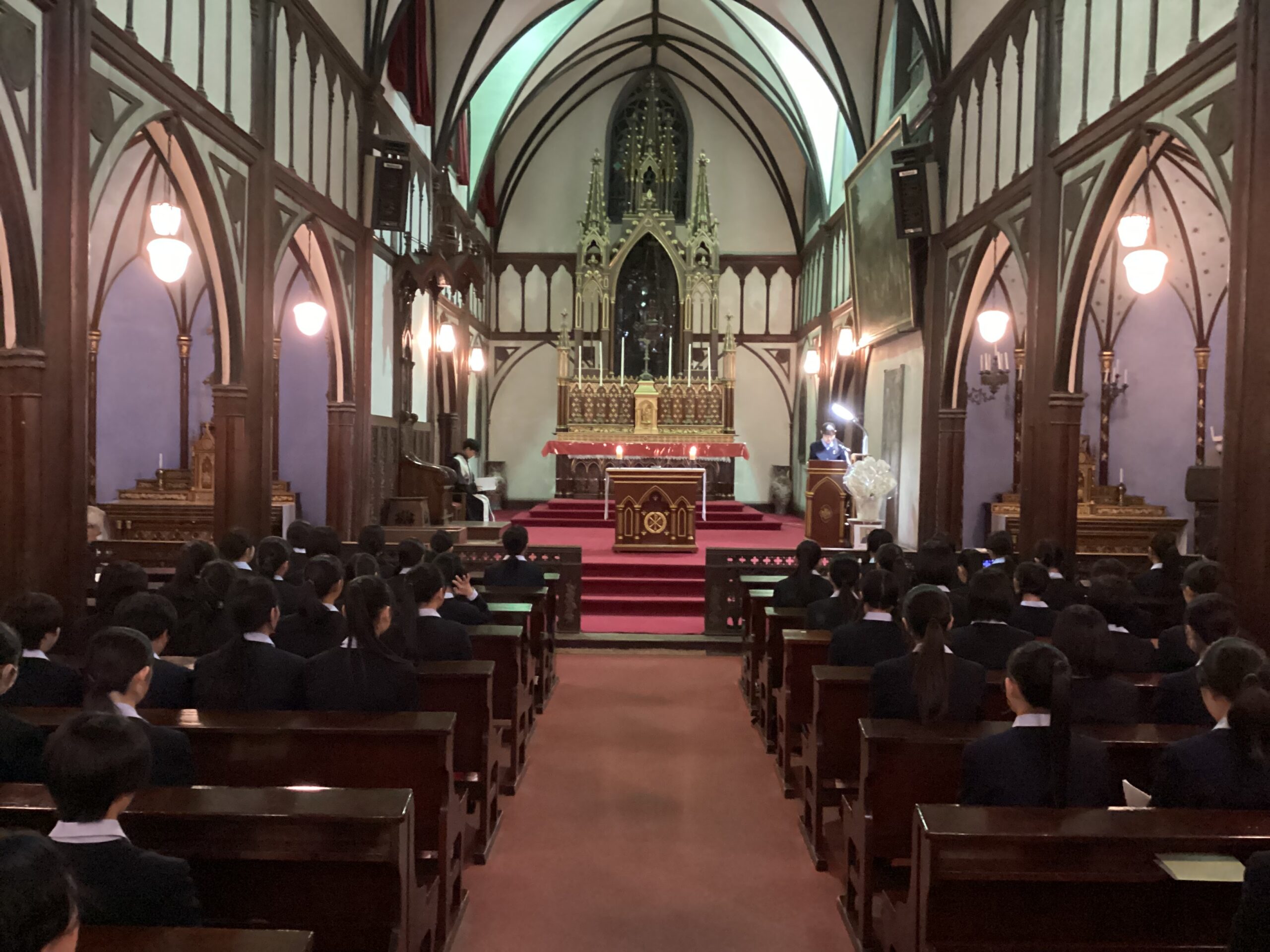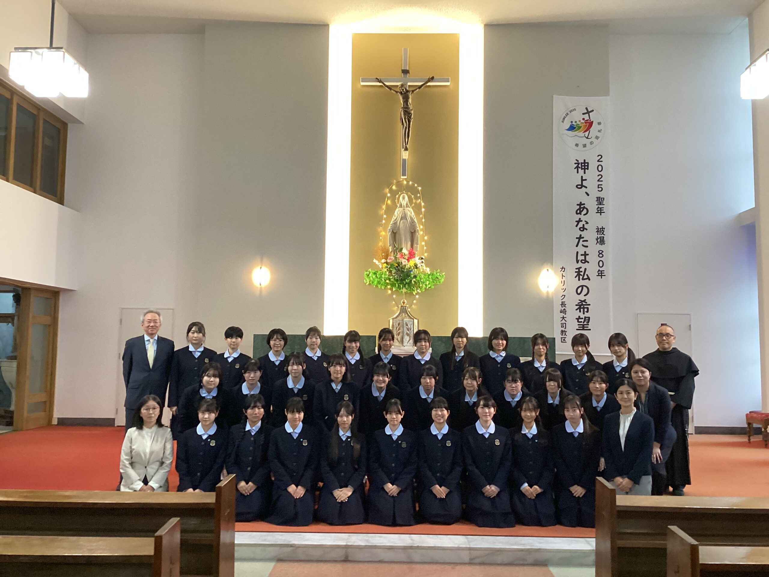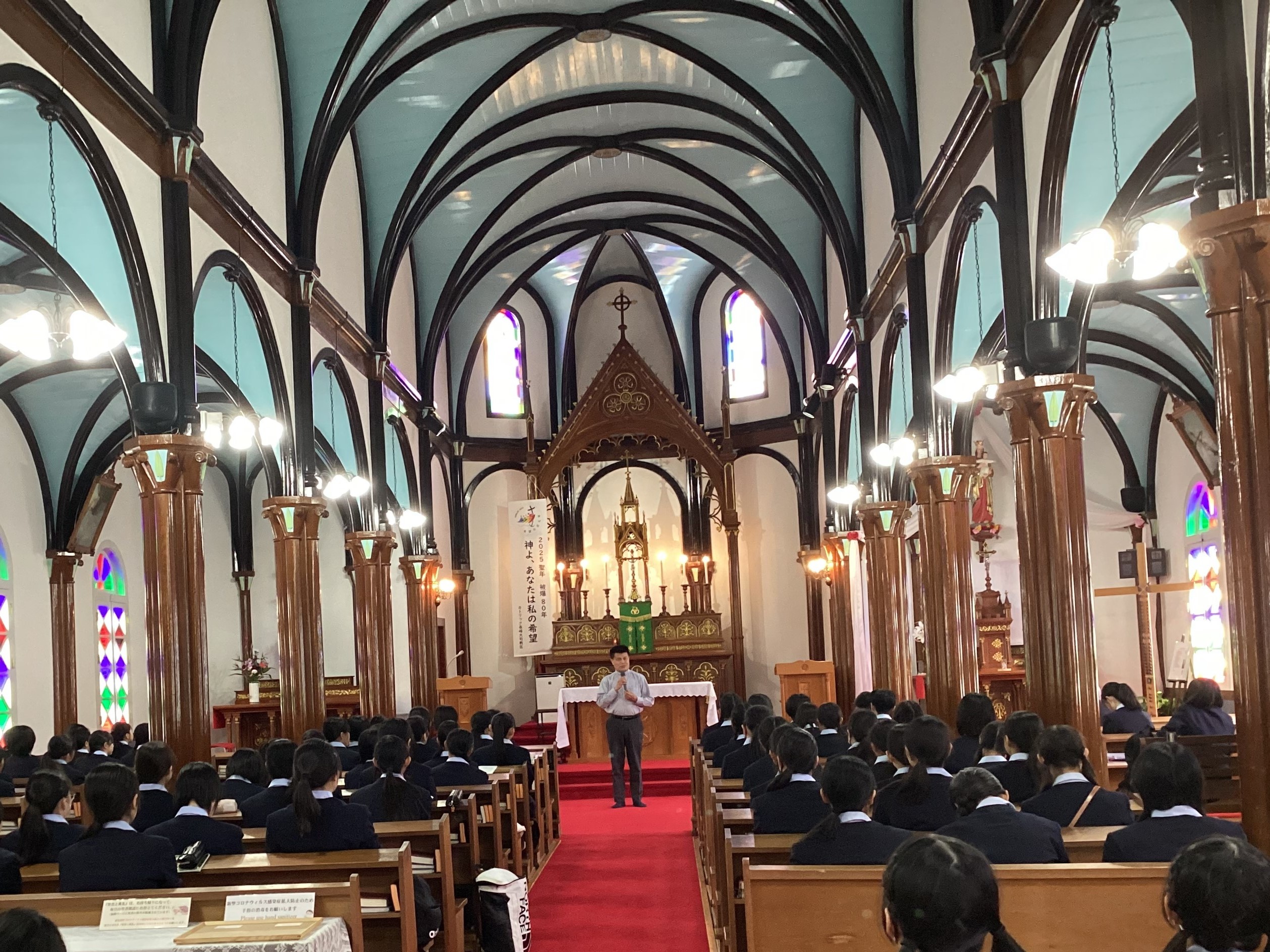 大浦天主堂での「み言葉の祭儀」では、4日間の研修旅行を振り返り、皆でこの地に集い、祈ることのできる、恵みに感謝する時間となりました。ライトアップされた夜の大浦天主堂はとても美しい眺めでした。