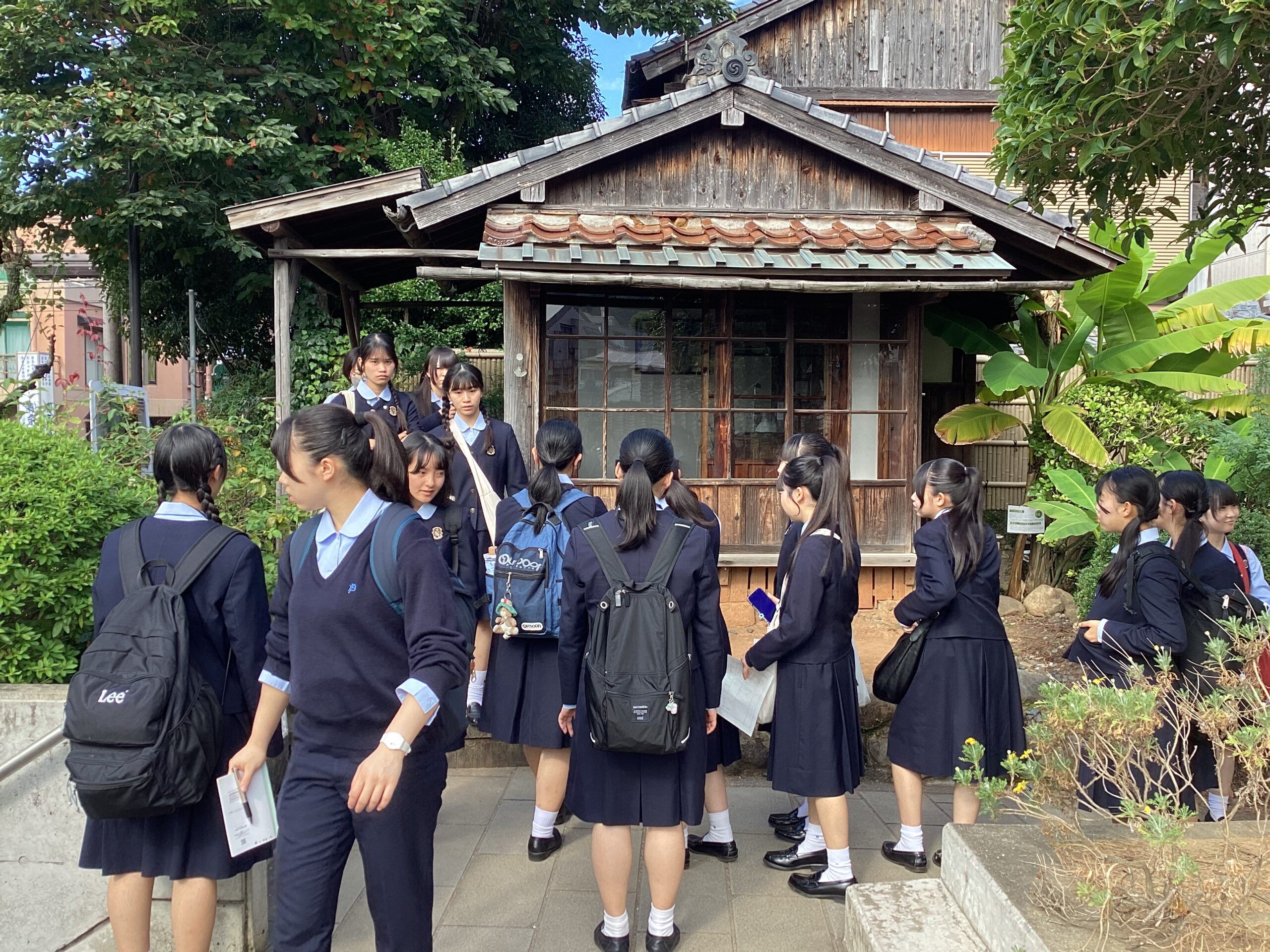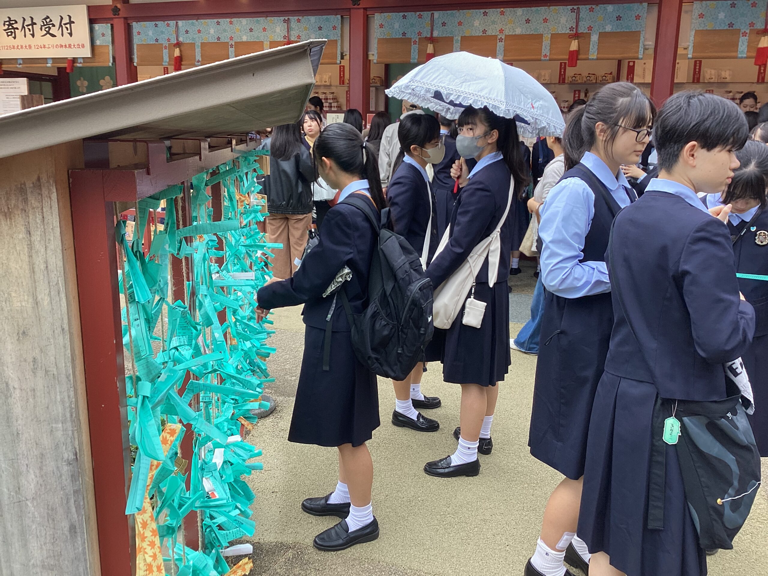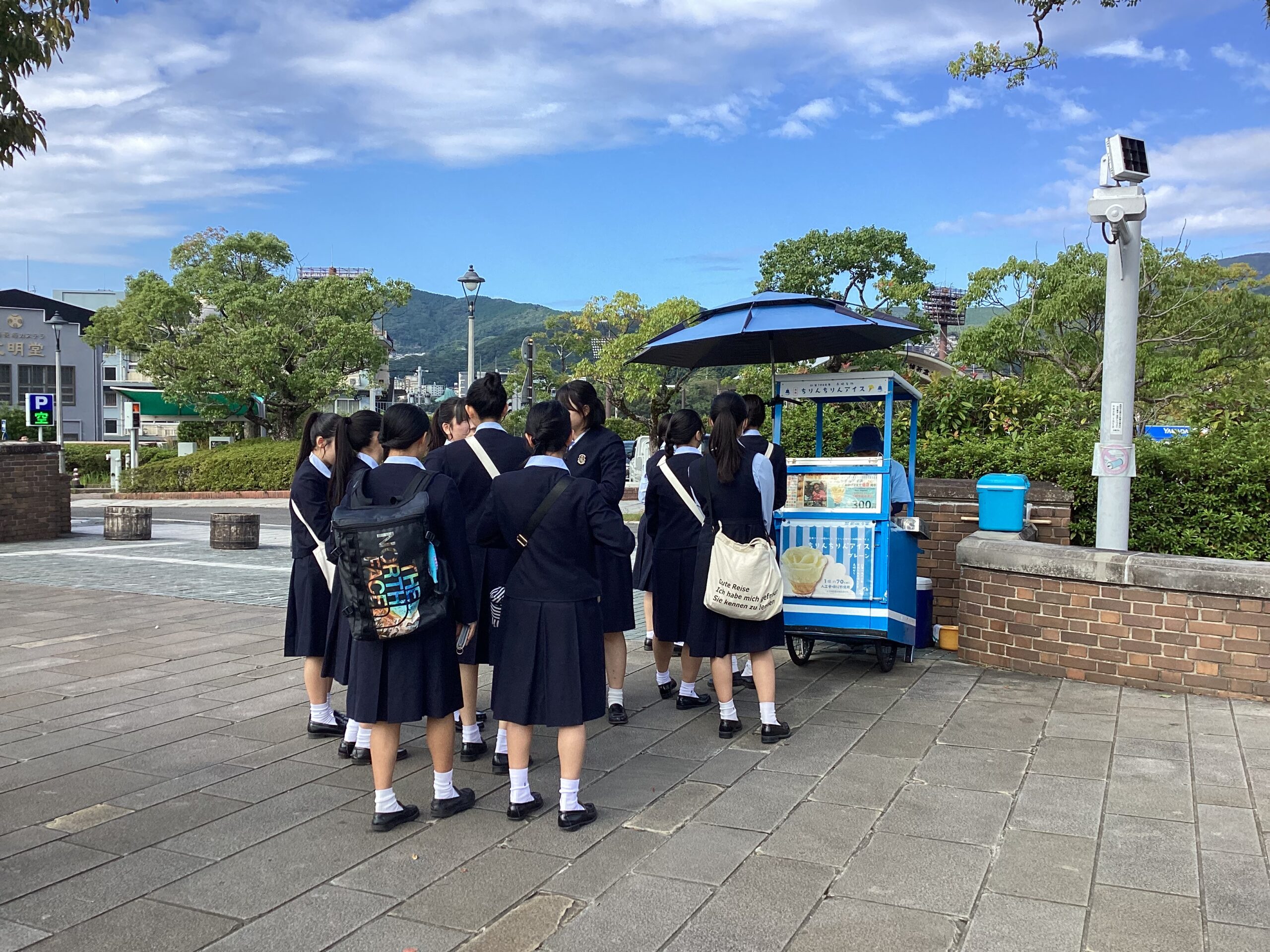 山口県を7時半に出発し、5時間のバス移動を経て長崎に到着しました。途中、青空も広がり、優しい風が吹く、過ごしやすい一日でした。生徒たちの様子から、自分の目で見て、耳で聞いて、心を動かし、その思いを仲間と分かち合う旅になっていることが感じられました。班ごと行程表の時間をしっかりと把握し、声を掛け合いながら、主体的に行動していました。
