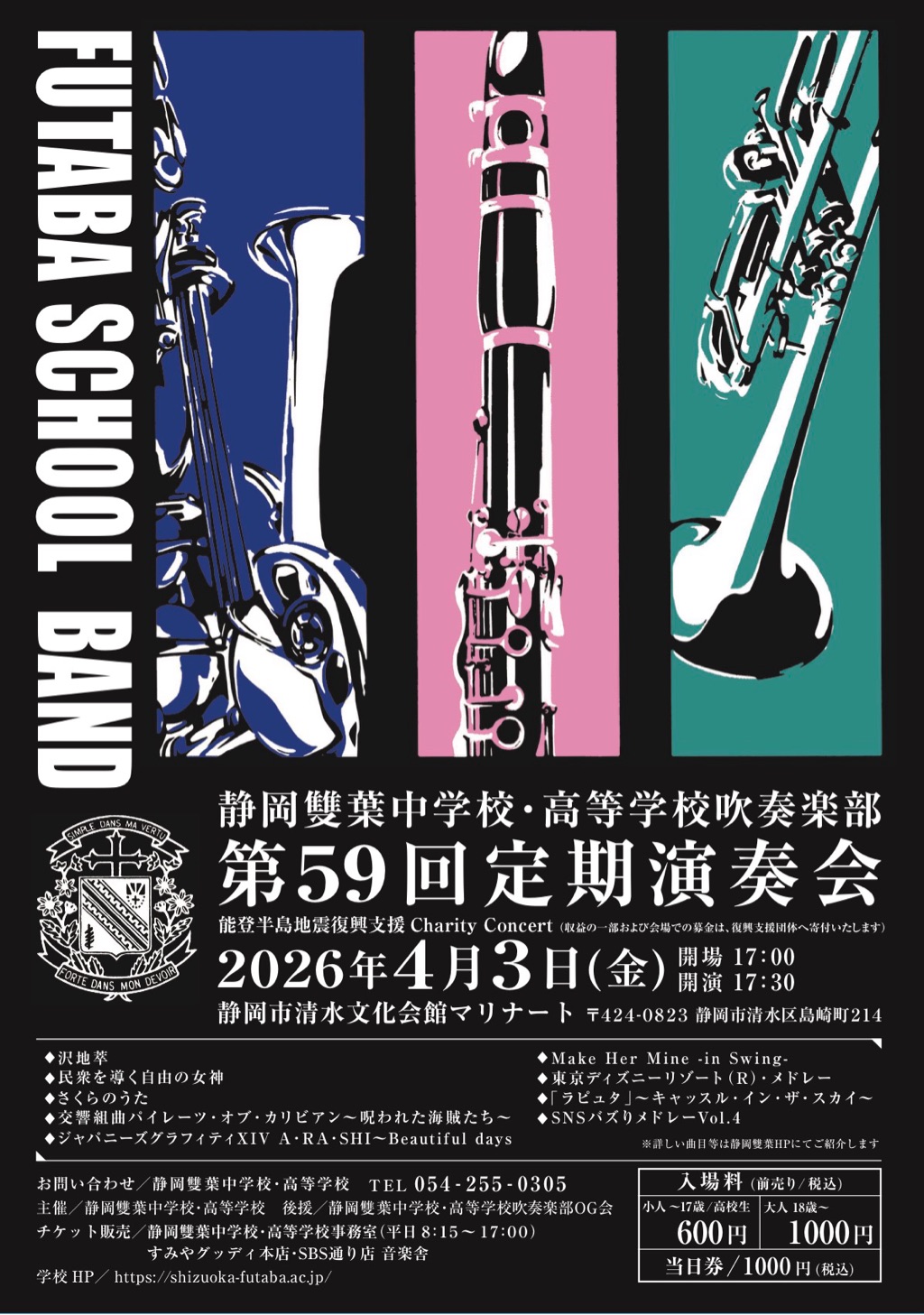 入場:小人(~17歳/高校生)600円、大人(18歳~)1,000円で前売り券を販売しております。本校事務室ほか市内楽器店でも購入できます。当日券は1,000円となります。